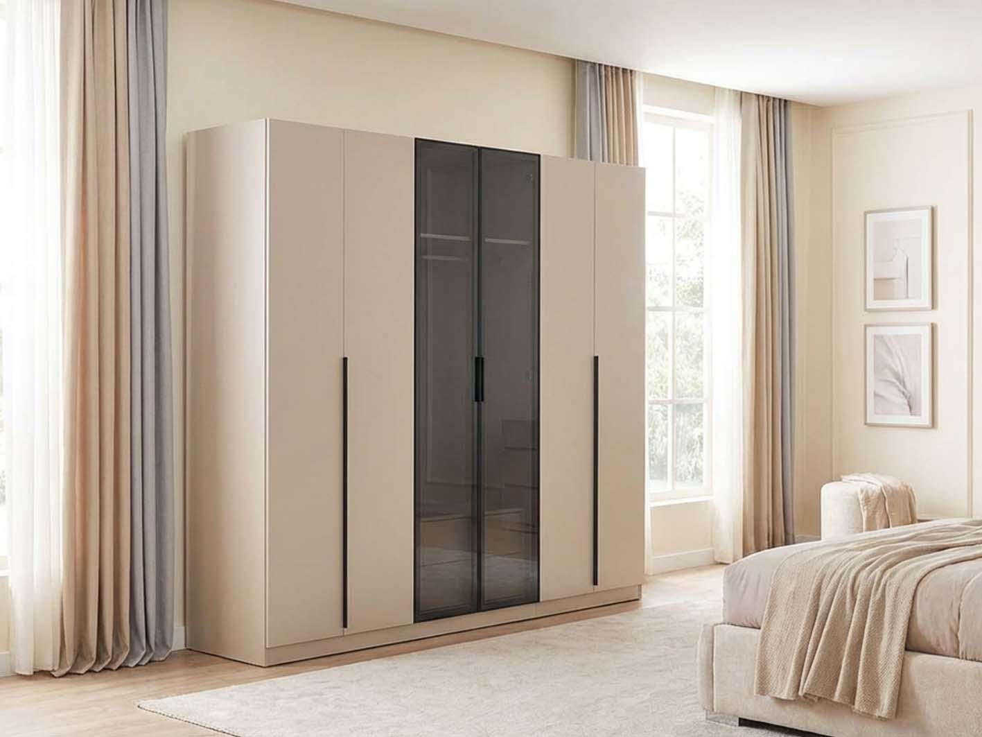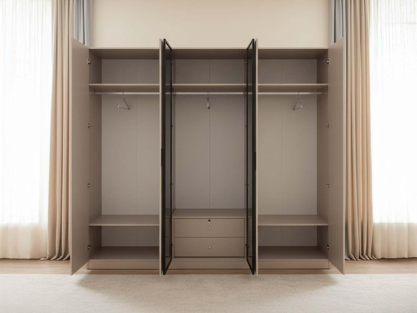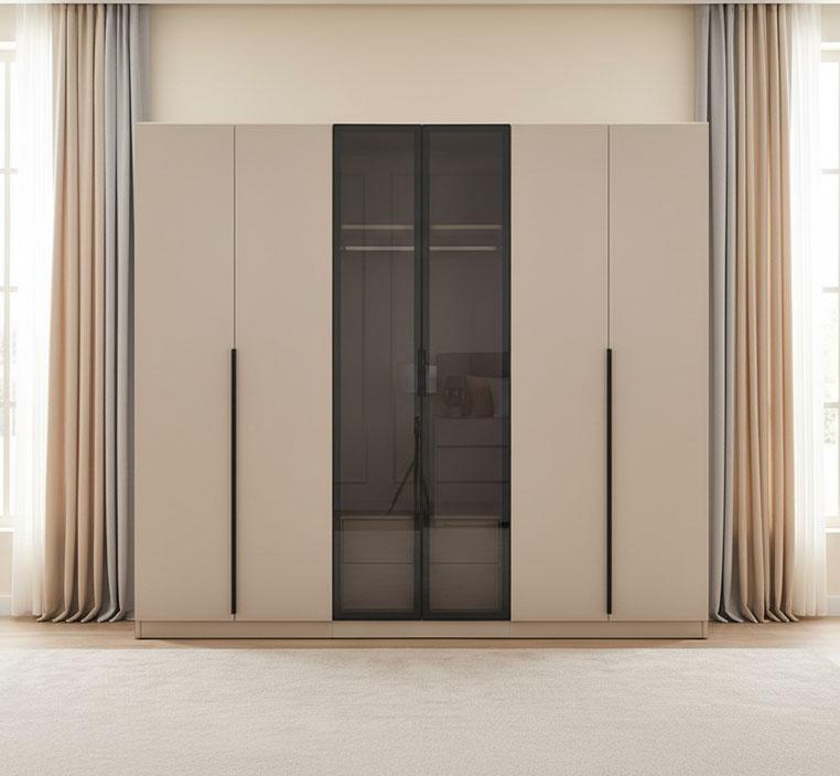دولاب هزال مصنوع من خشب MDF عالي الجودة، المعروف بمتانته ومقاومته للاستخدام اليومي، مع تشطيب ناعم يمنح مظهرًا أنيقًا وسطحًا سهل التنظيف. الأبواب الستة تفتح بسلاسة وتكشف عن توزيع داخلي ذكي يلبي مختلف احتياجات التخزين، من الملابس الطويلة إلى القطع الصغيرة والإكسسوارات.