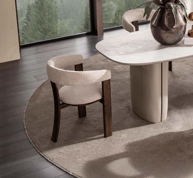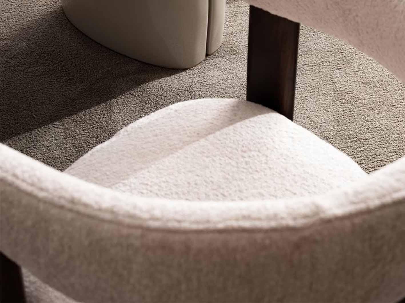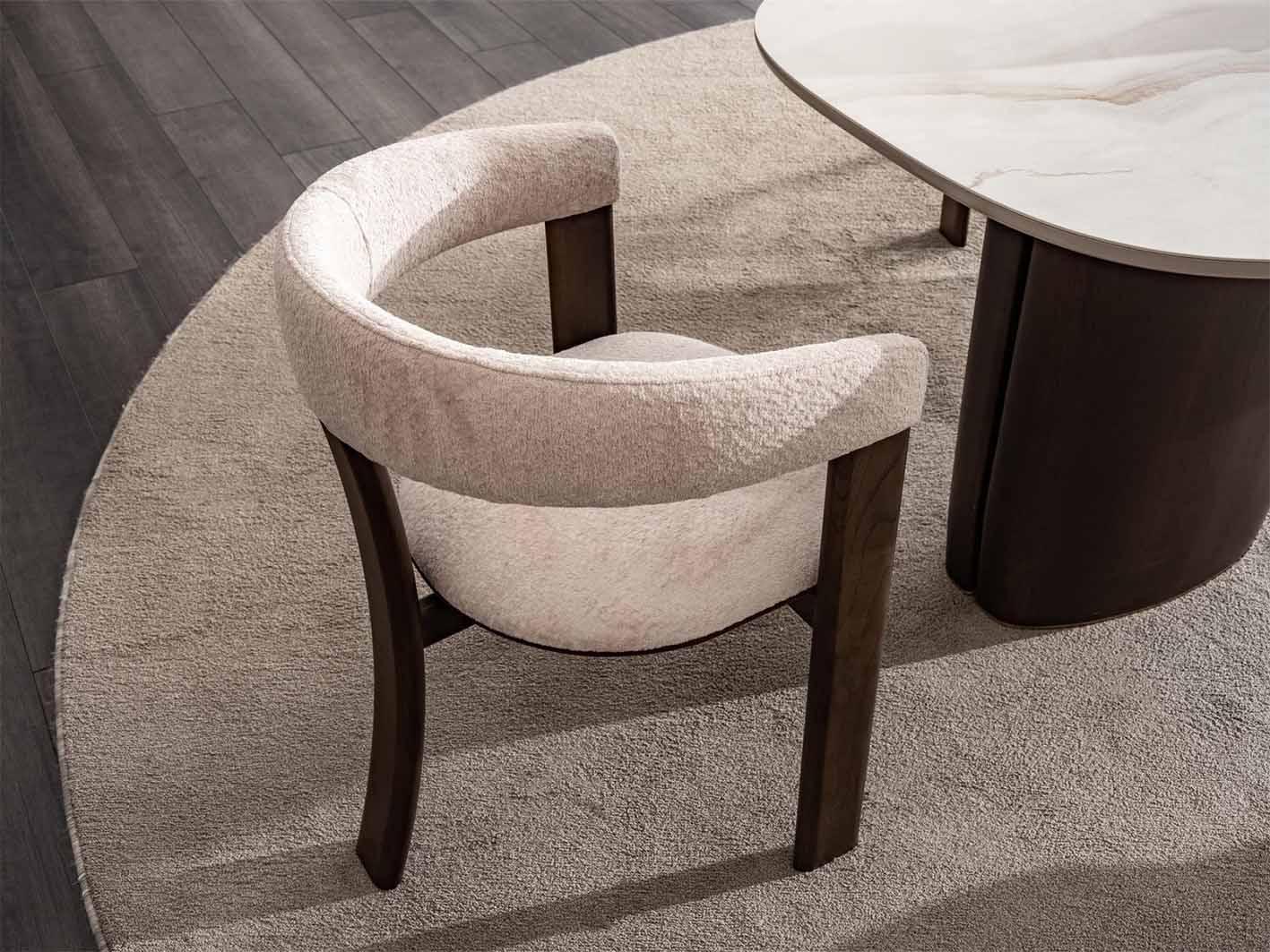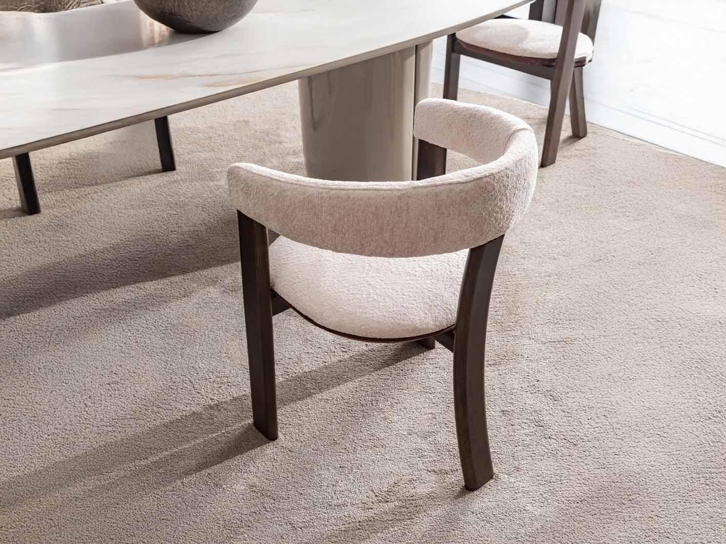 المقعد والظهر مبطنان بنسيج ناعم بلون كريمي هادئ، يوفّر راحة لا تضاهى وجاذبية بصرية تضفي إشراقًا وأناقة على أي غرفة. اللون الكريمي المتناسق مع الخشب البني يجعل من ايكون قطعة فنية تنسجم بسلاسة مع مختلف أنماط الديكور، سواء الكلاسيكي أو العصري.