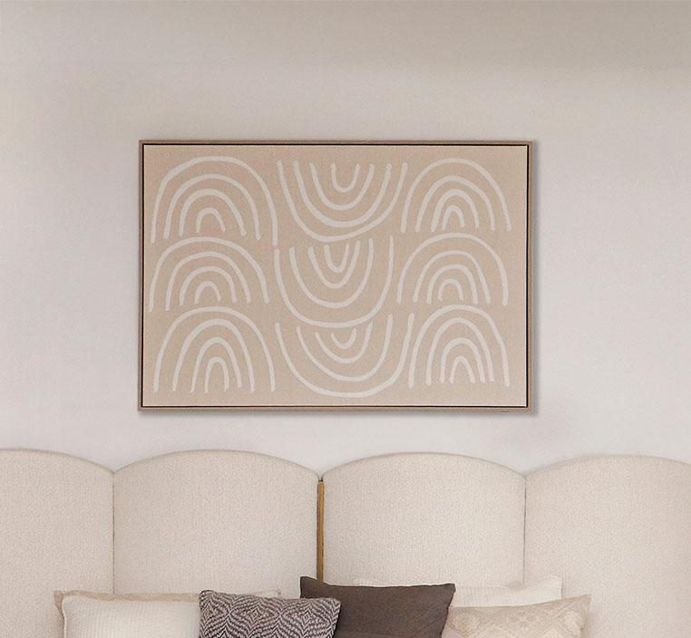 لوحة فنية التناغم تجسد هذه اللوحة الجميلة موجات بيضاء تتداخل بأناقة على خلفية بيج فاتح، مما يخلق نمطًا يشبه الأمواج. تعكس هذه اللوحة بساطة تصميمها وألوانها الهادئة جوًا من الهدوء والانسجام، مما يجعلها قطعة فنية مثالية لتعزيز الديكور الداخلي وإضفاء لمسة من السكينة على المكان.