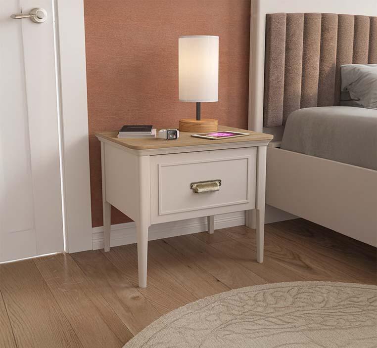 سطح خشبي واسع: يوفر السطح العلوي مساحة عملية لوضع مصباحك المفضل، كتبك، هاتفك، أو أي أغراض أخرى تحتاج إليها بجوار السرير، ليكون كل شيء في متناول يدك.