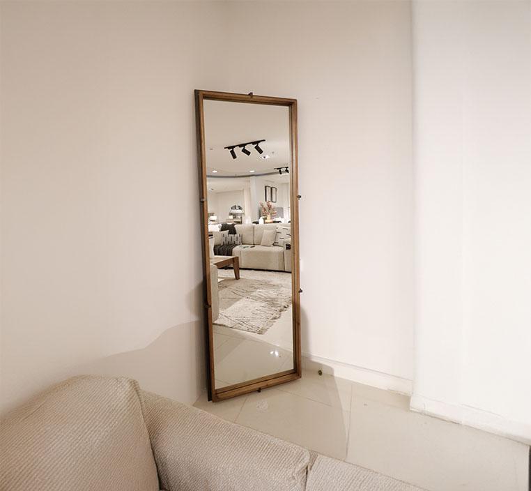 يمنح الإطار الخشبي البني الدافئ للمرآة لمسة من الفخامة والراحة، ويضفي عليها طابعًا عصريًا يناسب جميع أنواع الديكورات. يمكن إسنادها على الجدار بشكل مائل للحصول على تأثير بصري يعزز من اتساع الغرفة ورفع جمال المكان. هذا التصميم يجعلها مثالية للمساحات الصغيرة والكبيرة على حد سواء.