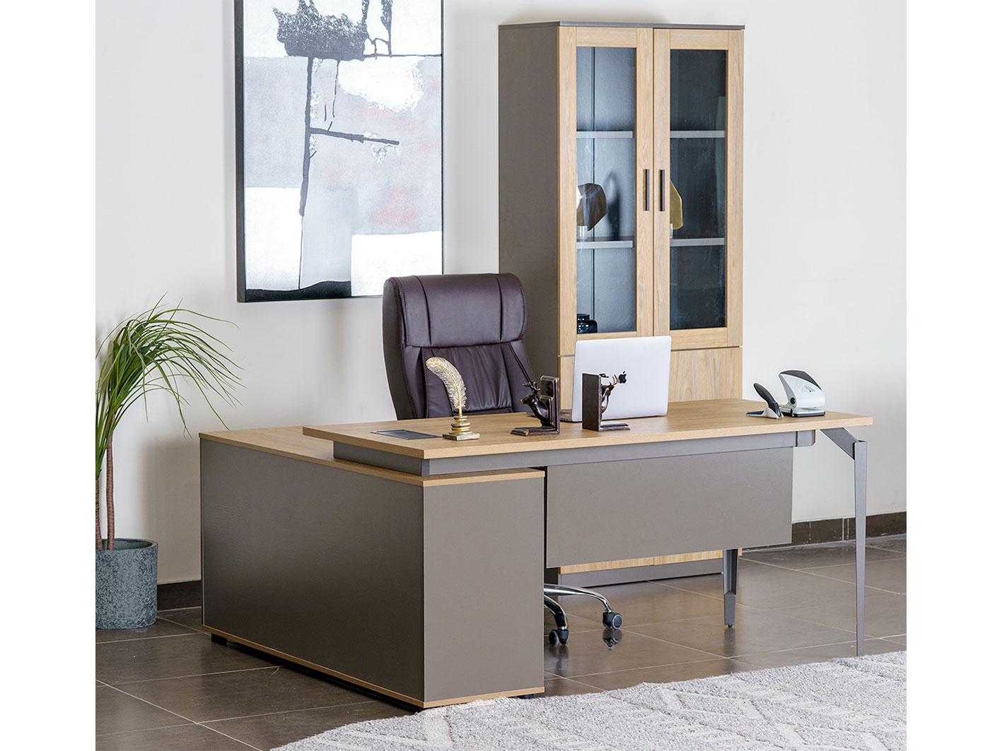 ألوان هادئة ومريحة: مزيج الخشبي والرمادي يوفر جوًا مريحًا يساعد على التركيز والإبداع في العمل.