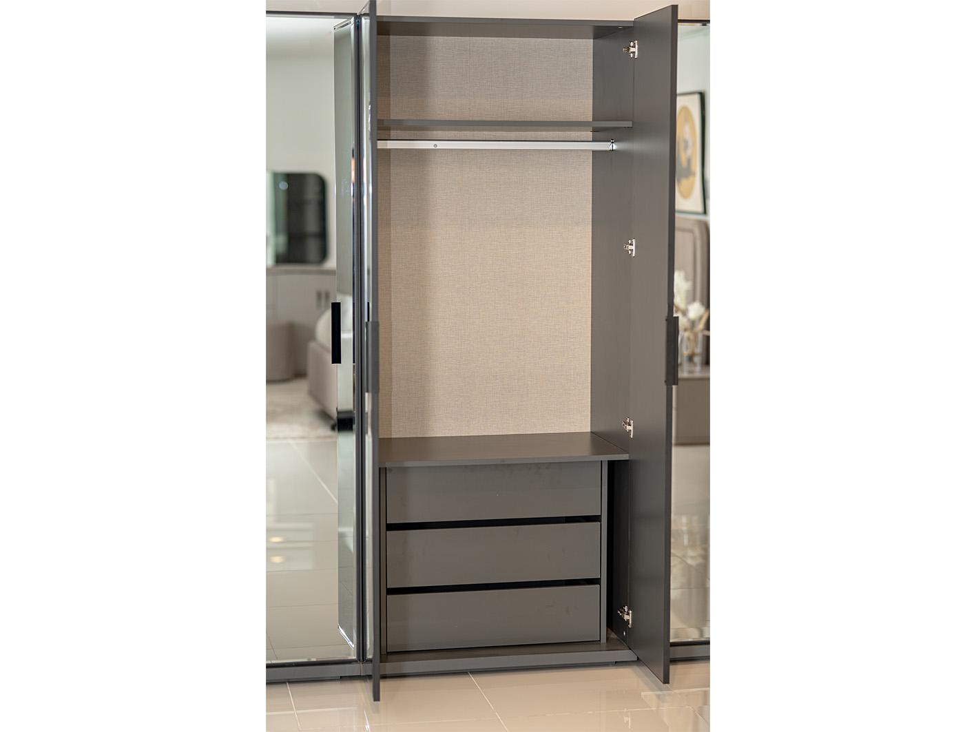 تصميم داخلي ذكي يشمل أرفف متعددة، مساحة واسعة لتعليق الملابس، وأدراج متينة لحفظ الأغراض الثمينة بأمان.