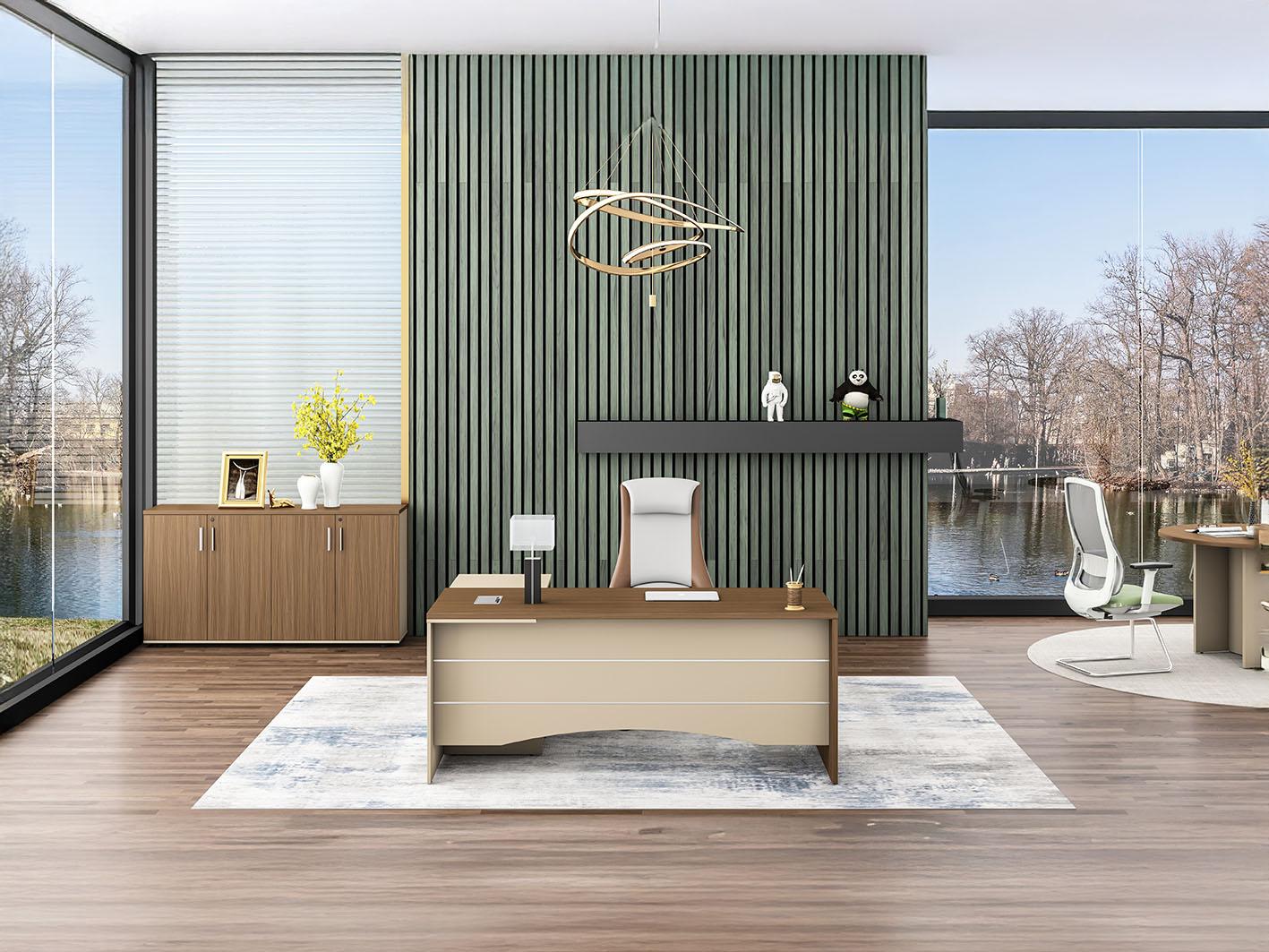 تم تصنيع المكتب باستخدام لوح خشبي صديق للبيئة من الدرجة E1 مع تشطيب ميلامين مستورد من علامة "Schattdecor"، لضمان مقاومة الخدوش والتآكل. يتميز المكتب بحواف PVC متينة بسُمك 2 ملم على السطح العلوي و1.2 ملم على الجوانب. السطح العلوي بسمك 25 ملم يمنح المكتب متانة فائقة تجعله مثاليًا للاستخدام اليومي المكثف.