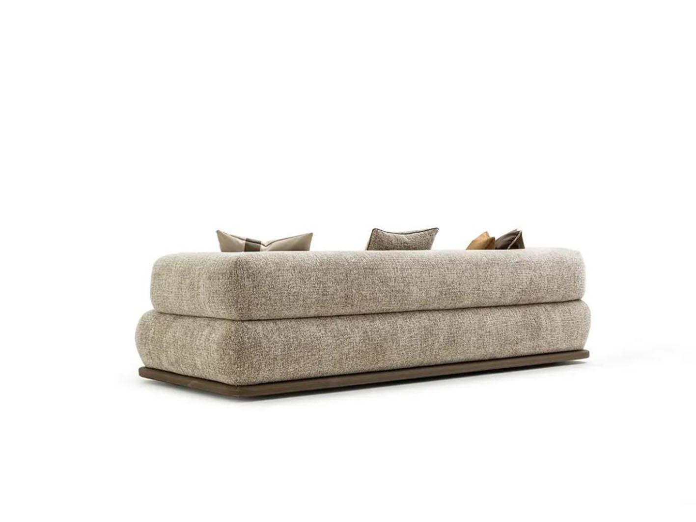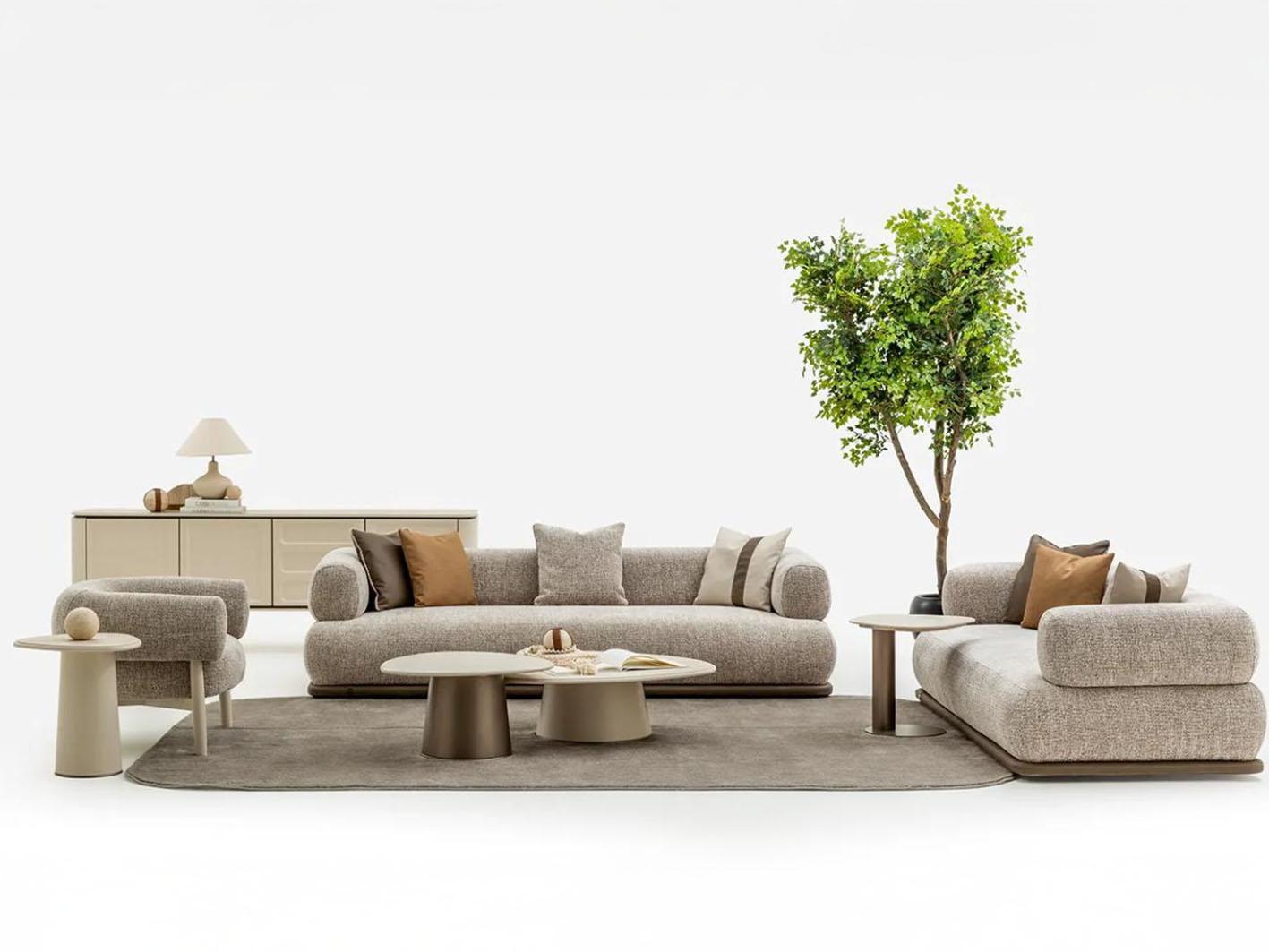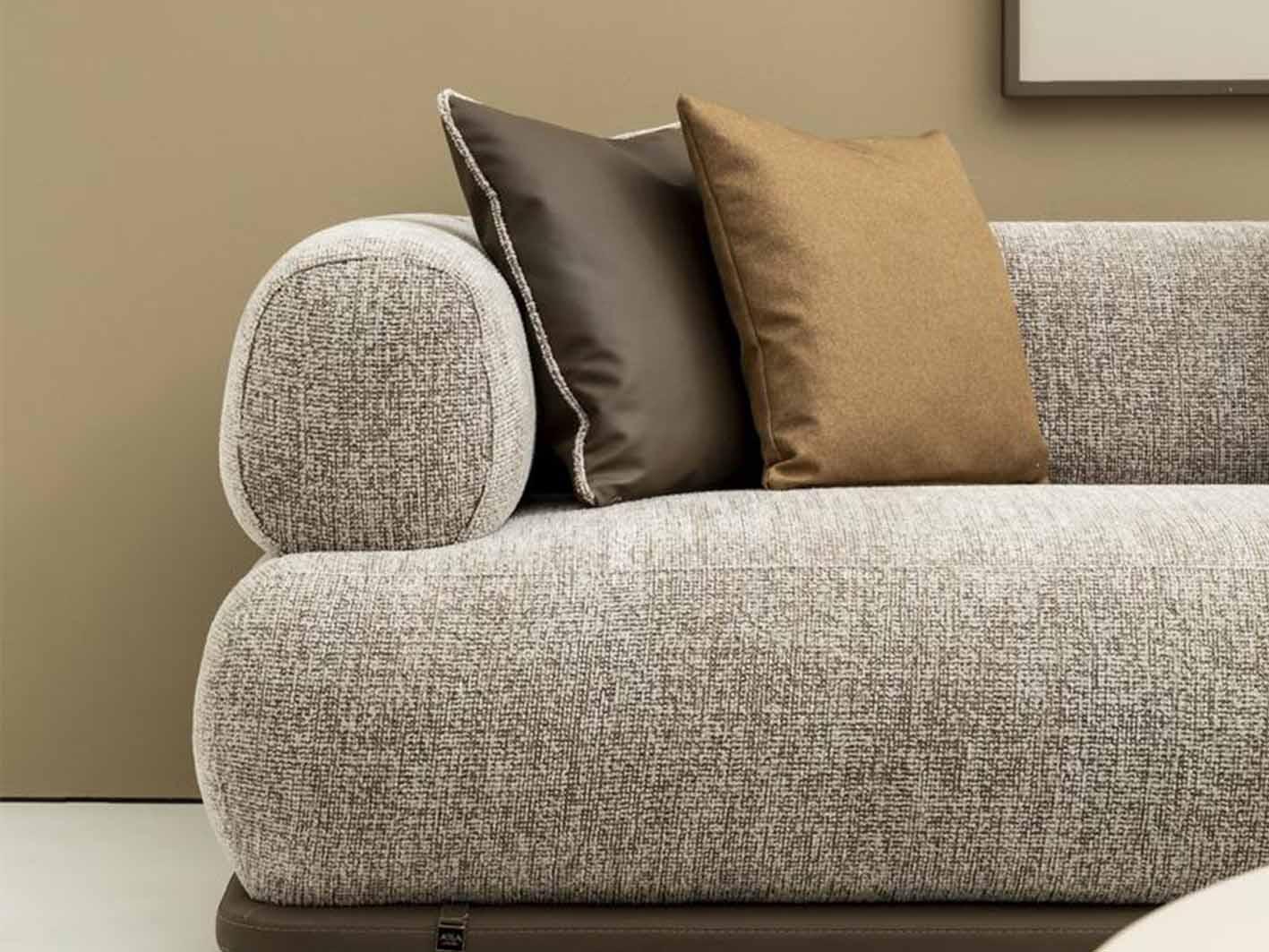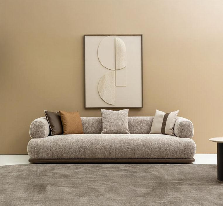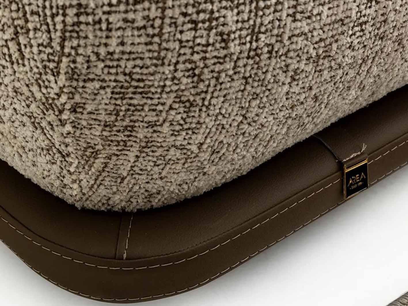 تم تغطية الكنب بخامة البوكليه العصرية، وهي خامة ناعمة الملمس تمنح إحساساً مريحاً وتتحمل الاستخدام اليومي. هذا القماش من أبرز صيحات الديكور الحديثة ويضفي لمسة فاخرة معاصرة على منزلك.
