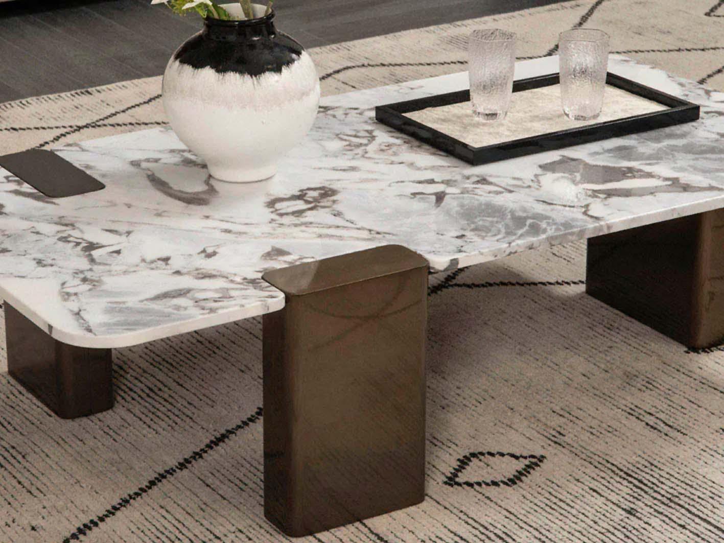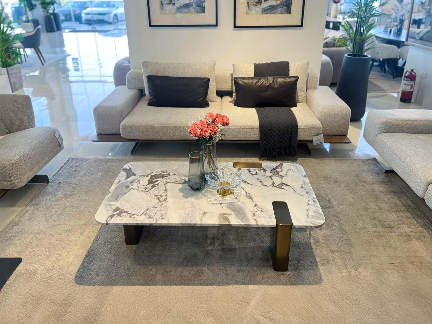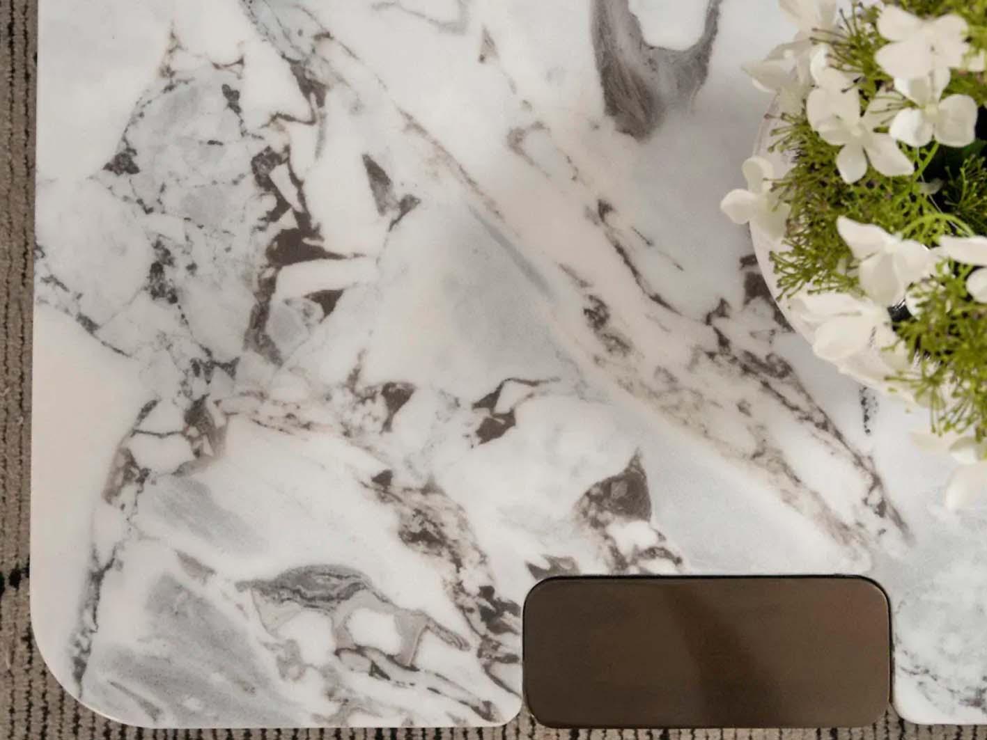 تتميز الطاولة بسطح من الرخام الصناعي الفاخر، بتصميم عصري ونقوش جذابة تضيف بعدًا بصريًا جذابًا للمكان. اللون المحايد للسطح يتيح دمجه بسلاسة مع قطع الأثاث الأخرى.