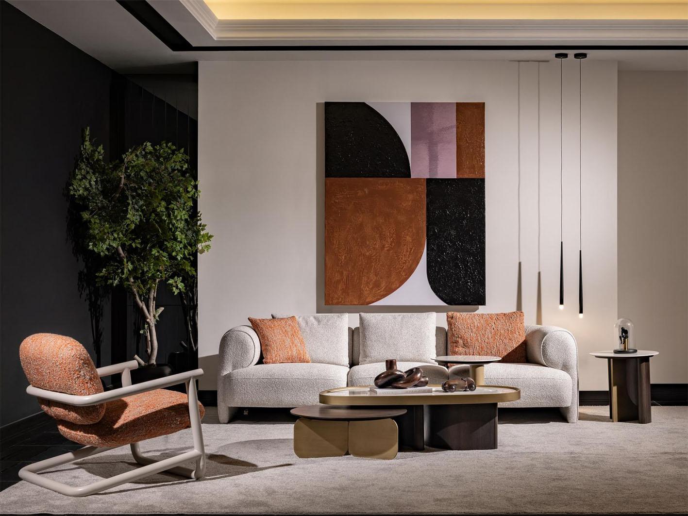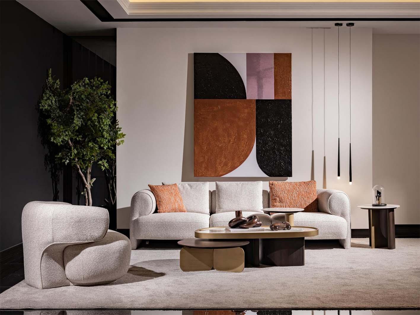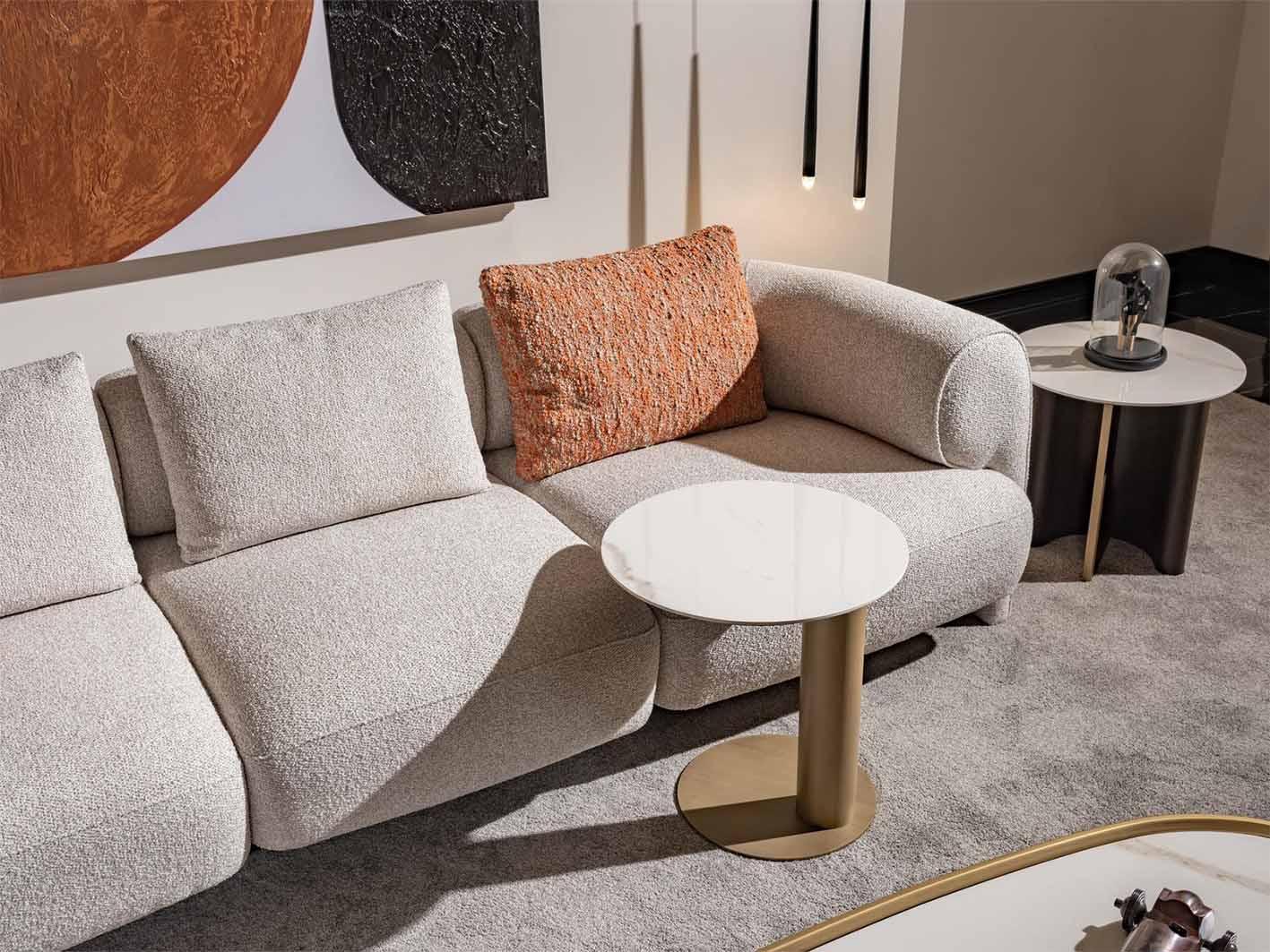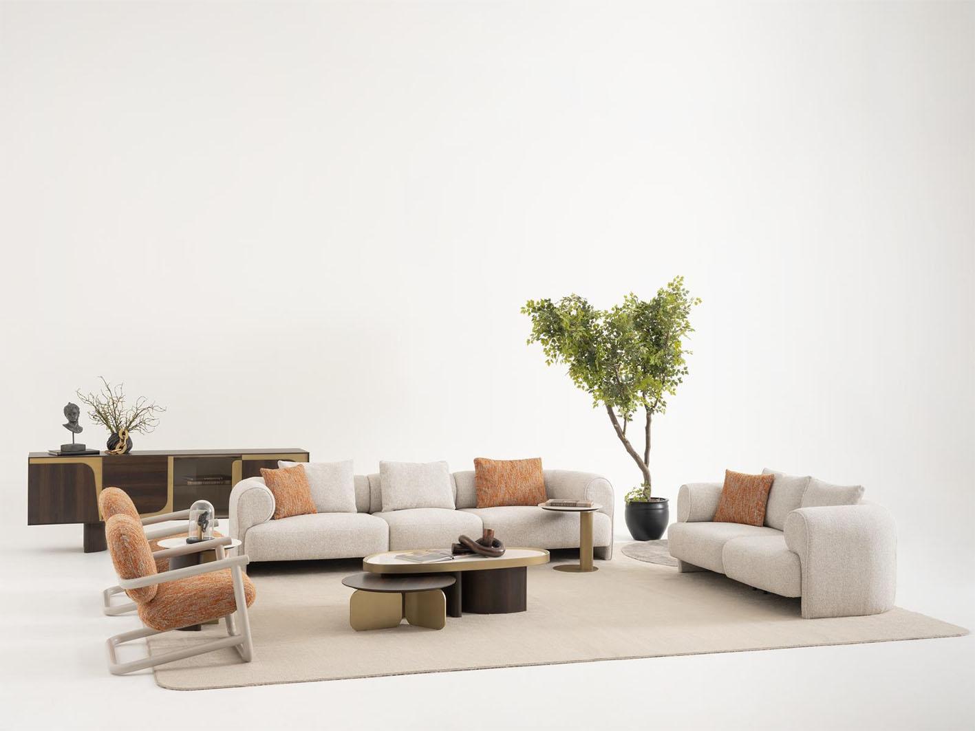 يأتي الكنب مغطى بخامة Boucle - Linen Blend بنسبة (%73 أكريليك، %16 بوليستر، %11 قطن)، لتمنح القماش ملمسًا ناعمًا ومتينًا في آنٍ واحد، مثالي للاستخدام اليومي.