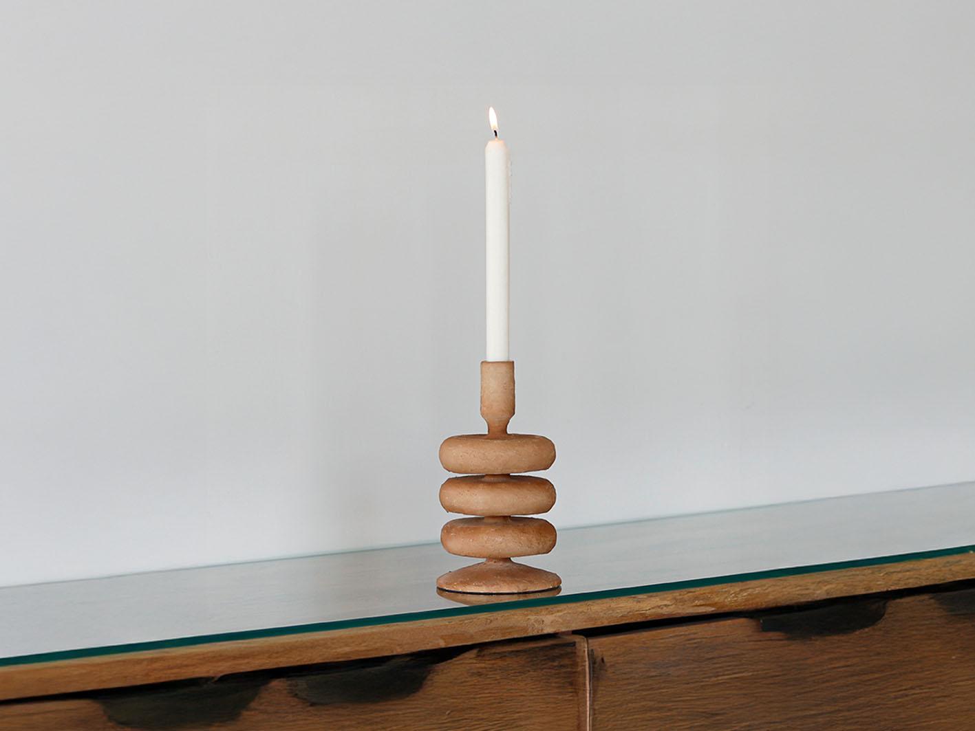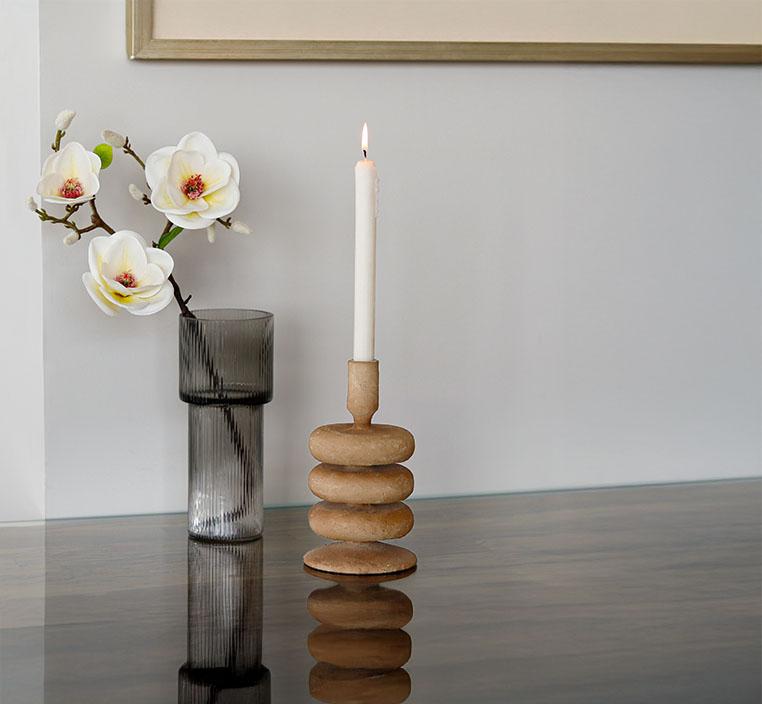 يعد هذا الشمعدان البوهيمي البني قطعة فنية تجمع بين البساطة والأناقة المستوحاة من الطابع الطبيعي. يتميز بتصميمه الفريد المكون من حلقات حجرية مستديرة تتكدس بانسيابية، مما يضفي لمسة هادئة ومتناغمة على أي ركن يوضع فيه.هذا الحامل لا يقوم فقط بوظيفة جمالية بل يخلق أيضاً أجواء دافئة ومريحة في المساحة. يمكن استخدامه على الطاولات الجانبية، أرفف الكتب أو طاولات الطعام لإضفاء لمسة من الهدوء الطبيعي والأناقة العصرية.