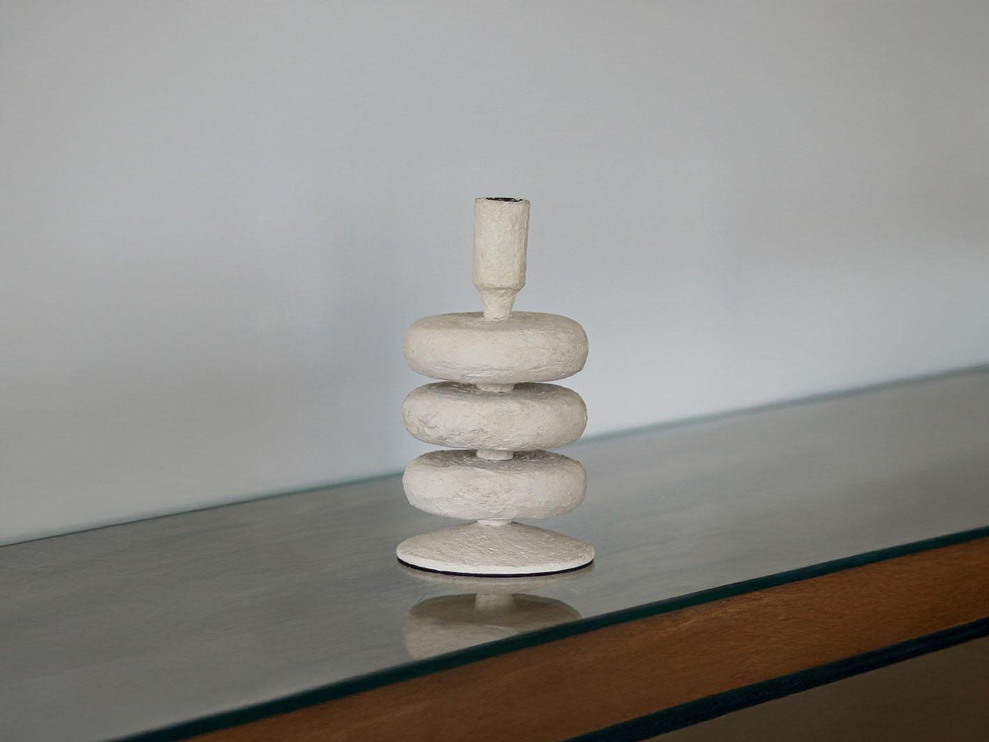 يعد هذا الشمعدان البوهيمي البيج قطعة فنية تجمع بين البساطة والأناقة المستوحاة من الطابع الطبيعي. يتميز بتصميمه الفريد المكون من حلقات حجرية مستديرة تتكدس بانسيابية، مما يضفي لمسة هادئة ومتناغمة على أي ركن يوضع فيه.هذا الحامل لا يقوم فقط بوظيفة جمالية بل يخلق أيضاً أجواء دافئة ومريحة في المساحة. يمكن استخدامه على الطاولات الجانبية، أرفف الكتب أو طاولات الطعام لإضفاء لمسة من الهدوء الطبيعي والأناقة العصرية.