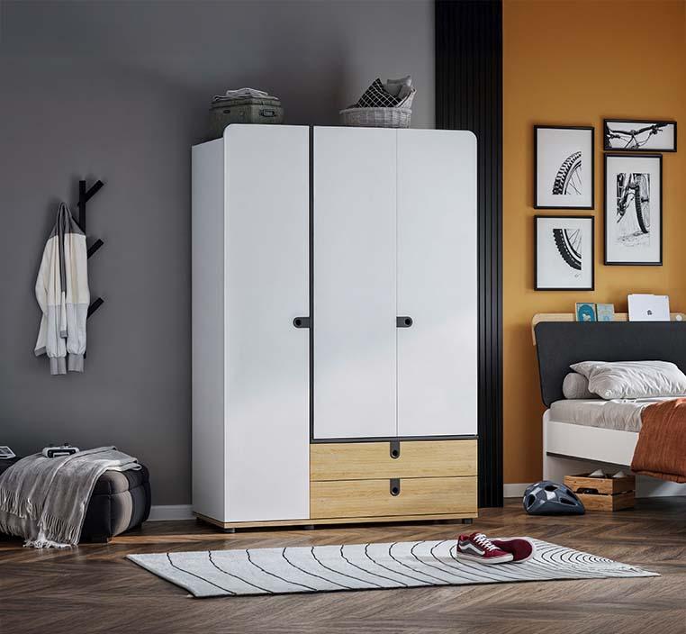 أبواب الدولاب مصنوعة من خشب مطلي باللون الأبيض عالي الجودة، في حين أن الأدراج ولوح القاعدة مصنوعان من خشب طبيعي قوي يضمن المتانة والاستدامة.