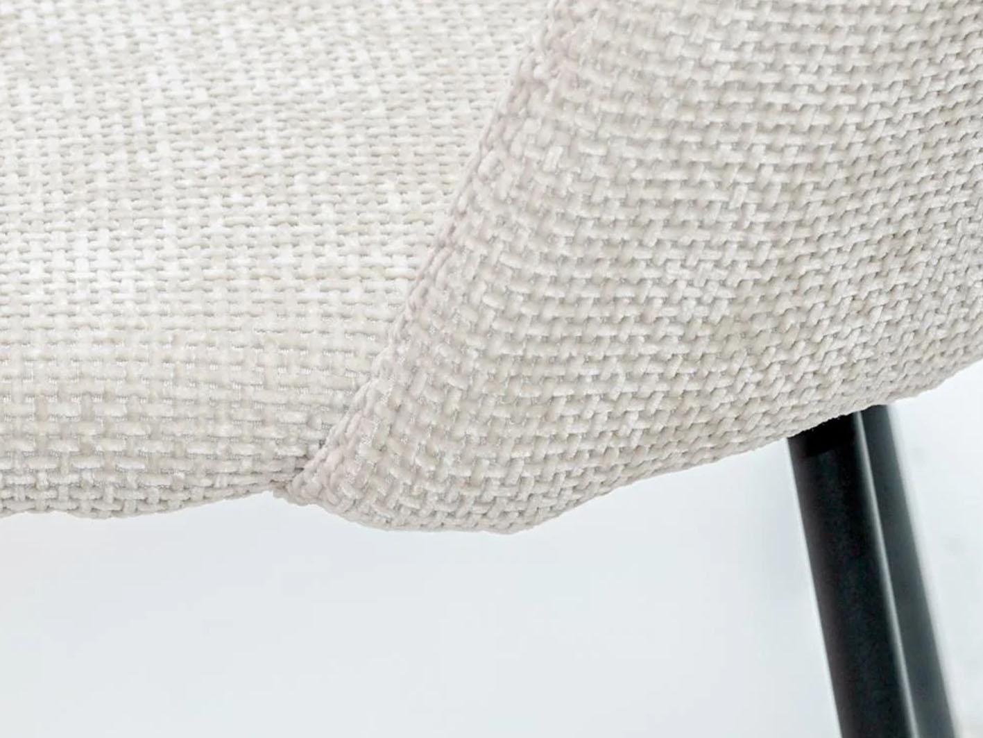 يعتمد الكرسي على أرجل معدنية متينة باللون الأسود المطفي، ما يخلق توازناً بصرياً جميلاً بين نعومة القماش وقوة المعدن. هذا التباين اللوني يجعل الكرسي مناسبًا لمختلف أنماط الديكور، سواء كان كلاسيكيًا، عصريًا، أو بسيطًا.