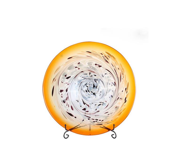 استمتع بجمال الطبق الديكوري الفريد من نوعه هذا،حيث يتميز بتصميمه اللفافي الجميل. الطبق مصنوع من الزجاج بألوان رائعة بالاضافة الي حامل من المعدن لدعم الاتزان.يتكون التصميم اللفافي من سلسلة من الدوائر المتراكبة يبدأ بهالة من اللون الاصفر وينتهي بالداخل بألوان متداخلة جميلة.يتم وضع الطبق على كونسول أو رف ليزيد من جمال المساحة المحيطة.