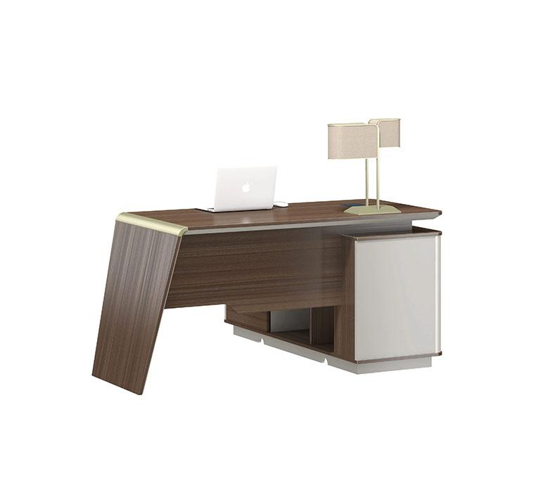 لمسات معدنية ذهبية: يضيف المكتب لمسات معدنية ذهبية راقية، تبرز جمال وأناقة التصميم، مما يمنحه مظهرًا فاخرًا يتناغم بشكل مثالي مع مزيج اللون الكريمي والبني، ليضفي إحساسًا بالفخامة والرقي على المكان.