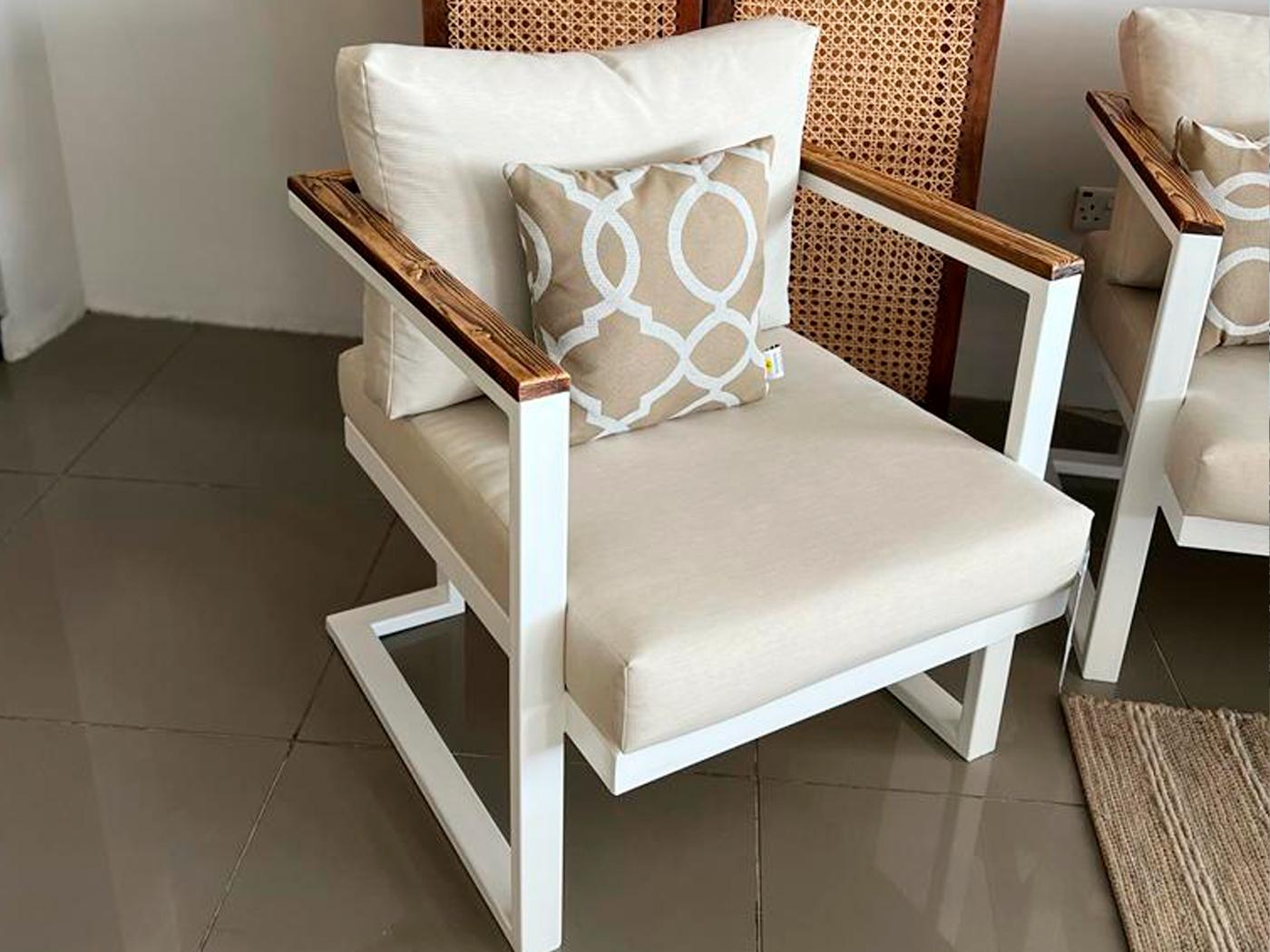 ليس فقط القماش هو ما يميز هذه الجلسة، بل إن الهيكل المعدني الصلب باللون الأبيض يضيف لمسة من الحداثة، في حين أن اللمسات الخشبية الطبيعية التي تزين محيط الكنبة تعطيها طابعًا فاخرًا ورقيًا. هذه المكونات الفاخرة تجعل من جلسة يوكن الفردية خيارًا غير تقليدي، يجمع بين الأناقة العملية والتصميم المريح.