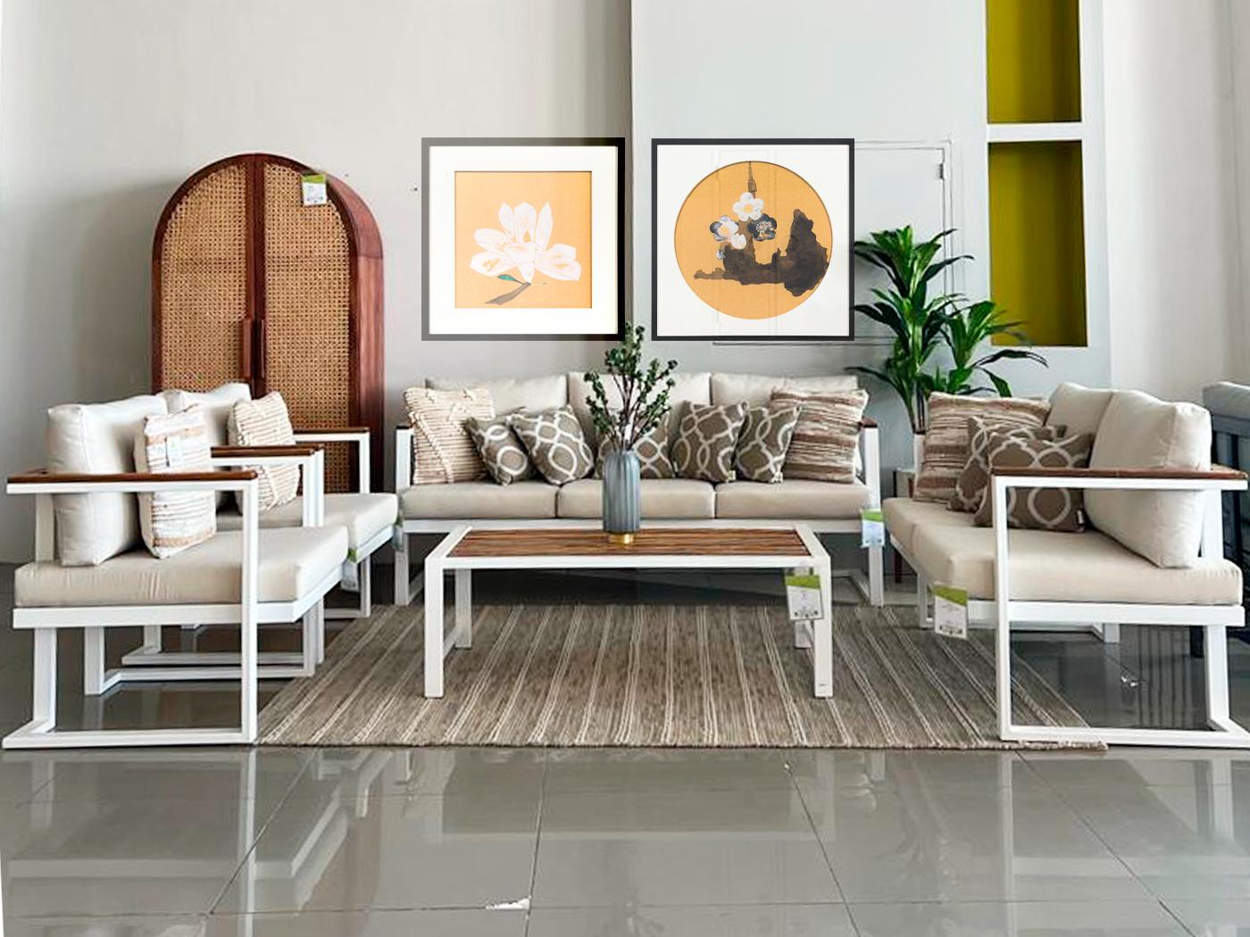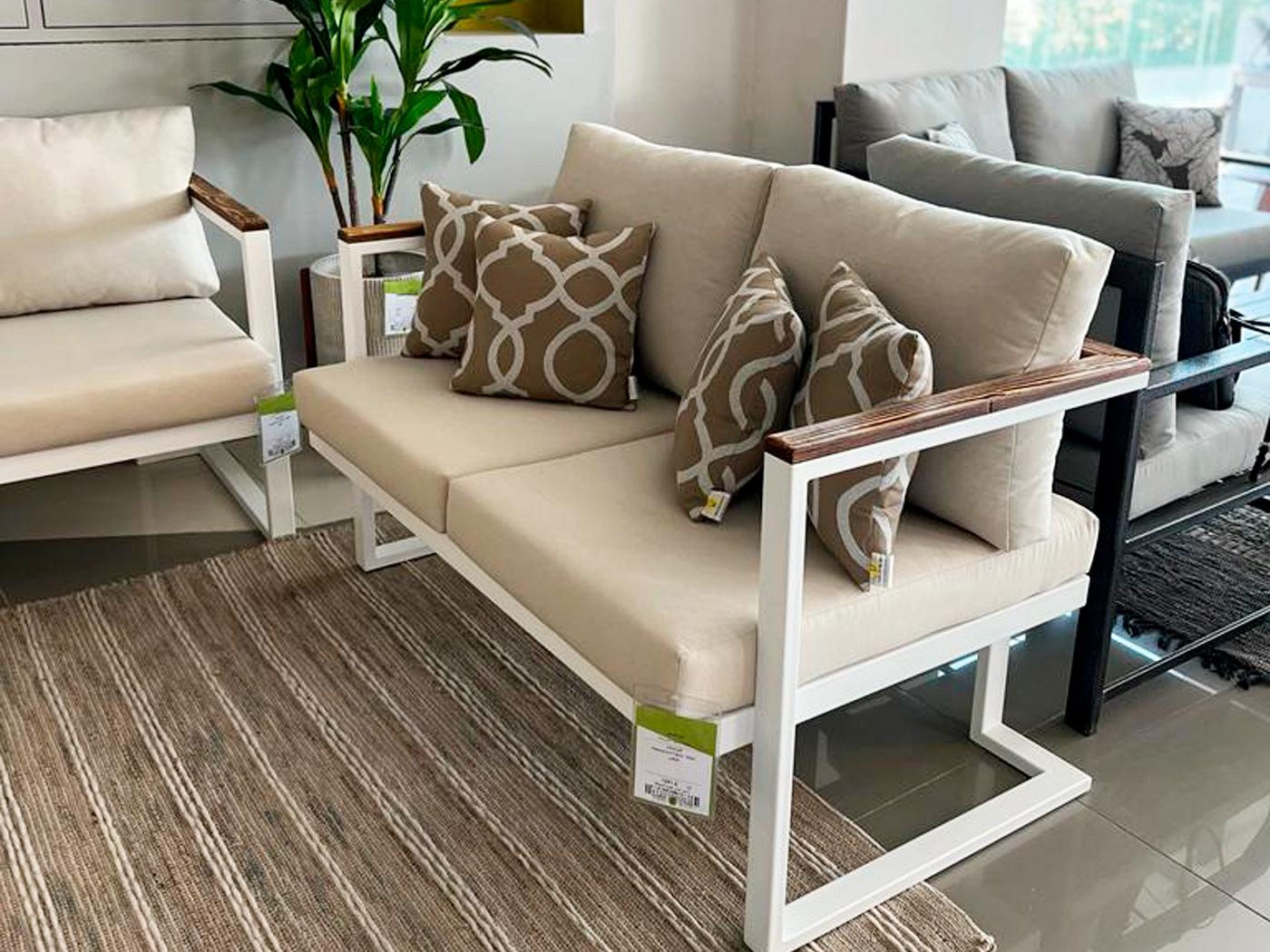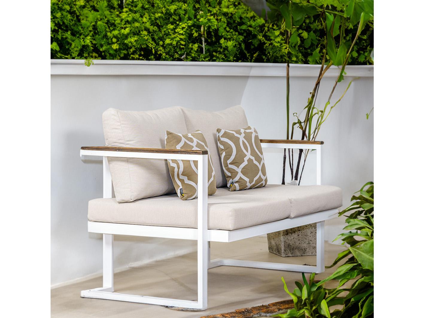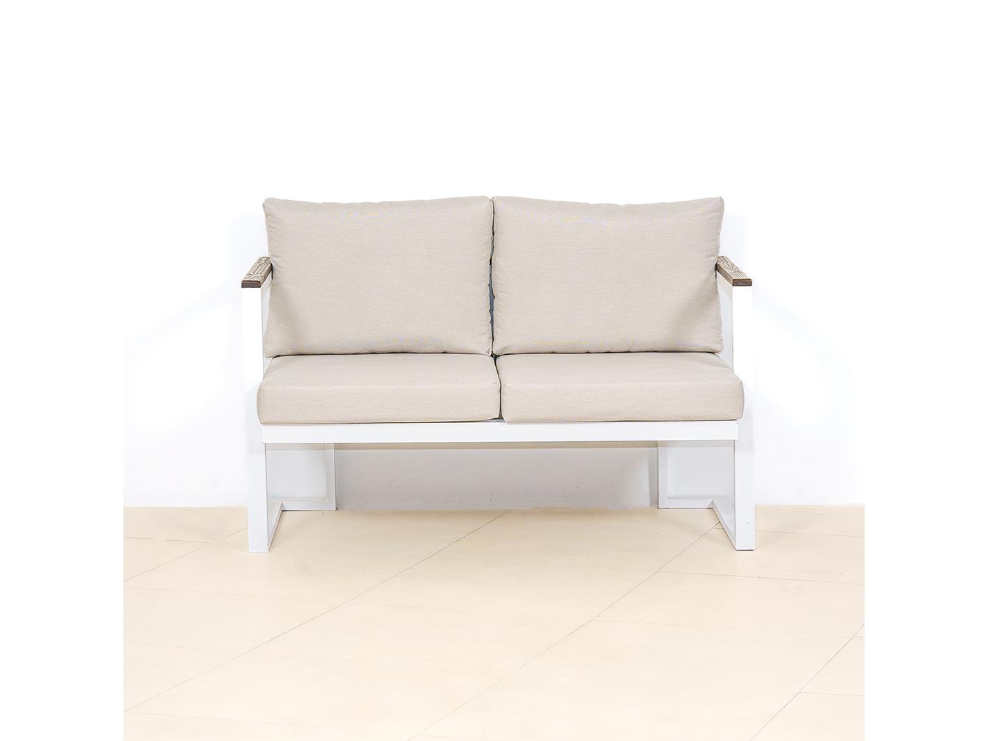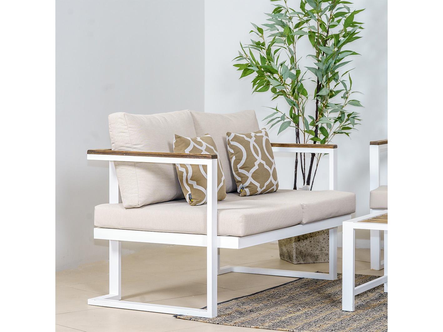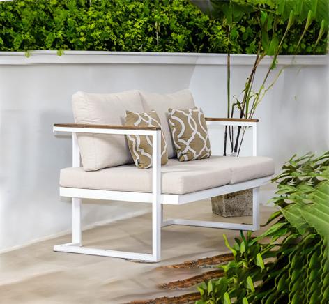 ليس فقط القماش هو ما يميز هذه الجلسة، بل إن الهيكل المعدني الصلب باللون الأبيض يضيف لمسة من الحداثة، في حين أن اللمسات الخشبية الطبيعية التي تزين محيط الكنبة تعطيها طابعًا فاخرًا ورقيًا. هذه المكونات الفاخرة تجعل من جلسة يوكن الثنائية خيارًا غير تقليدي، يجمع بين الأناقة العملية والتصميم المريح.