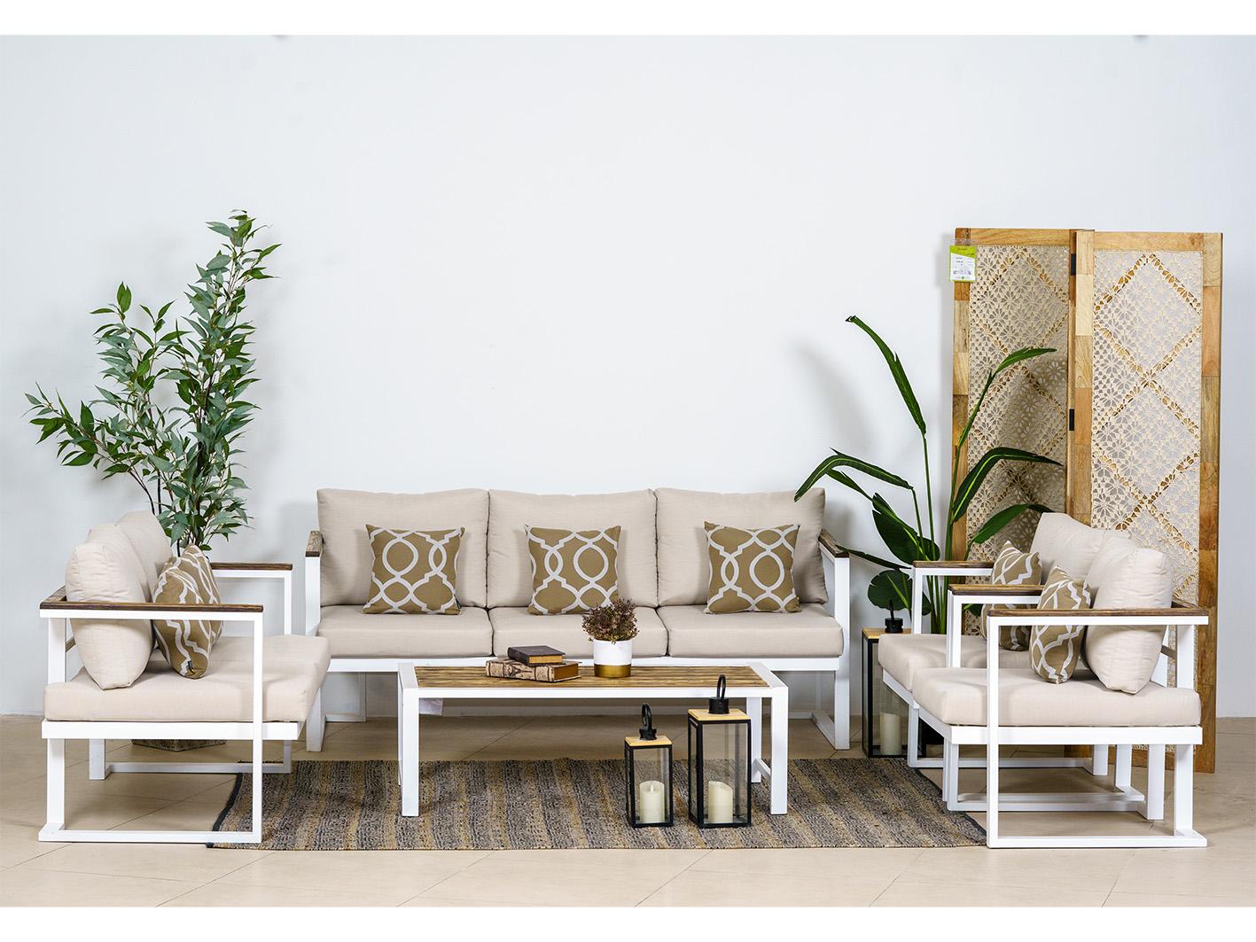 يعتبر استخدام الخشب الطبيعي في التصميم عنصرًا جماليًا يجذب الأنظار، حيث يضفي لمسة من التميز والذوق الرفيع على الأثاث. الإطار المعدني الأبيض يبرز بشكل مثالي مع الأقمشة البيج، مما يجعلها تتناغم بسلاسة مع مختلف تنسيقات الحدائق، من المساحات الحديثة إلى التقليدية.