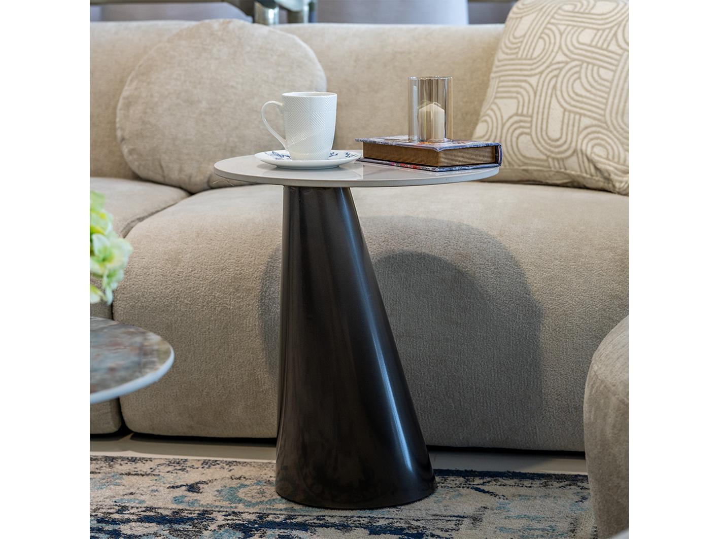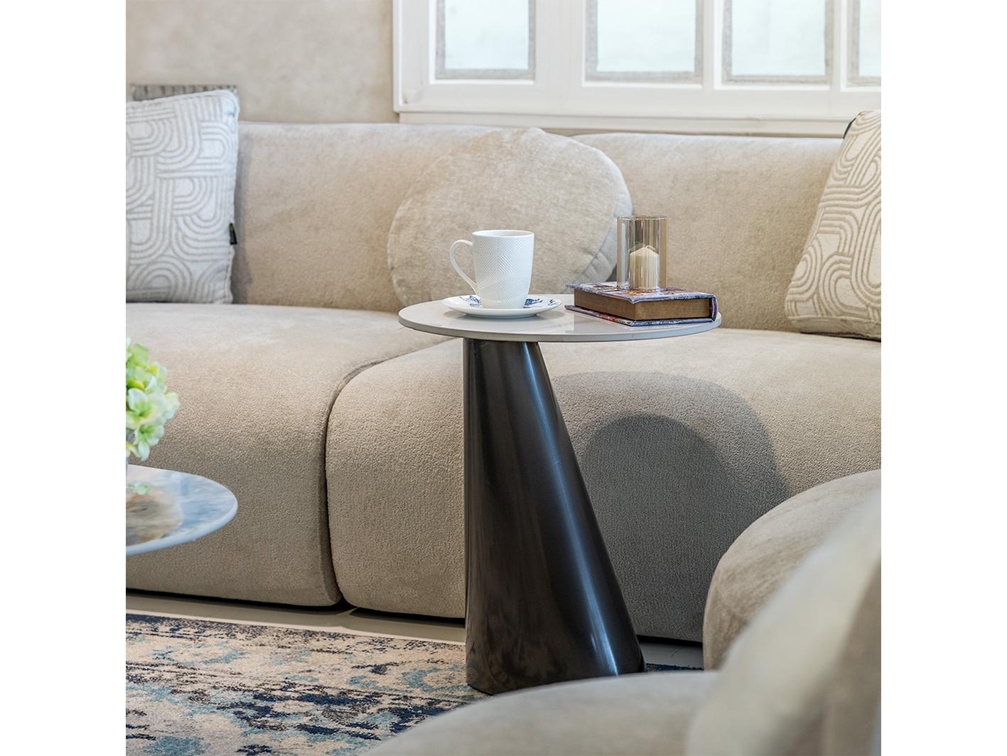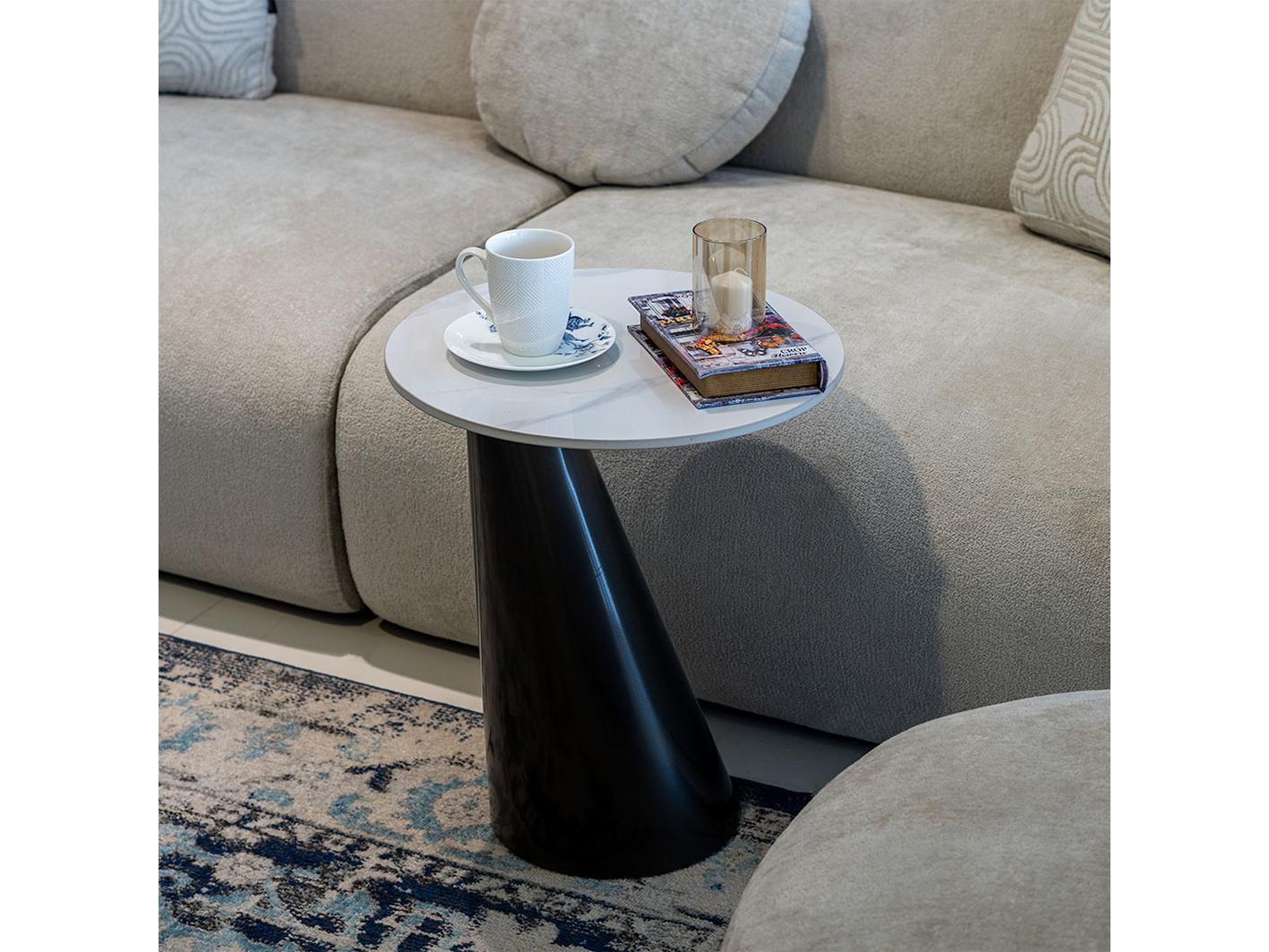 جملي اثاث غرفة معيشتك بطاولة خدمة زجنا الرائعة , تتميز الطاولة بمظهر استثنائي حيث تأتي بقاعدة معدنية علي شكل مخروط يجعلها ذات رونق خاص بالاضافة سطحها الدائري الرخامي الناعم الذي يجعلها سهلة التنظيف والعناية . الطاولة مصنوعة من خامات عالية الجودة مما يضمن لها الاستدامة والتحمل .