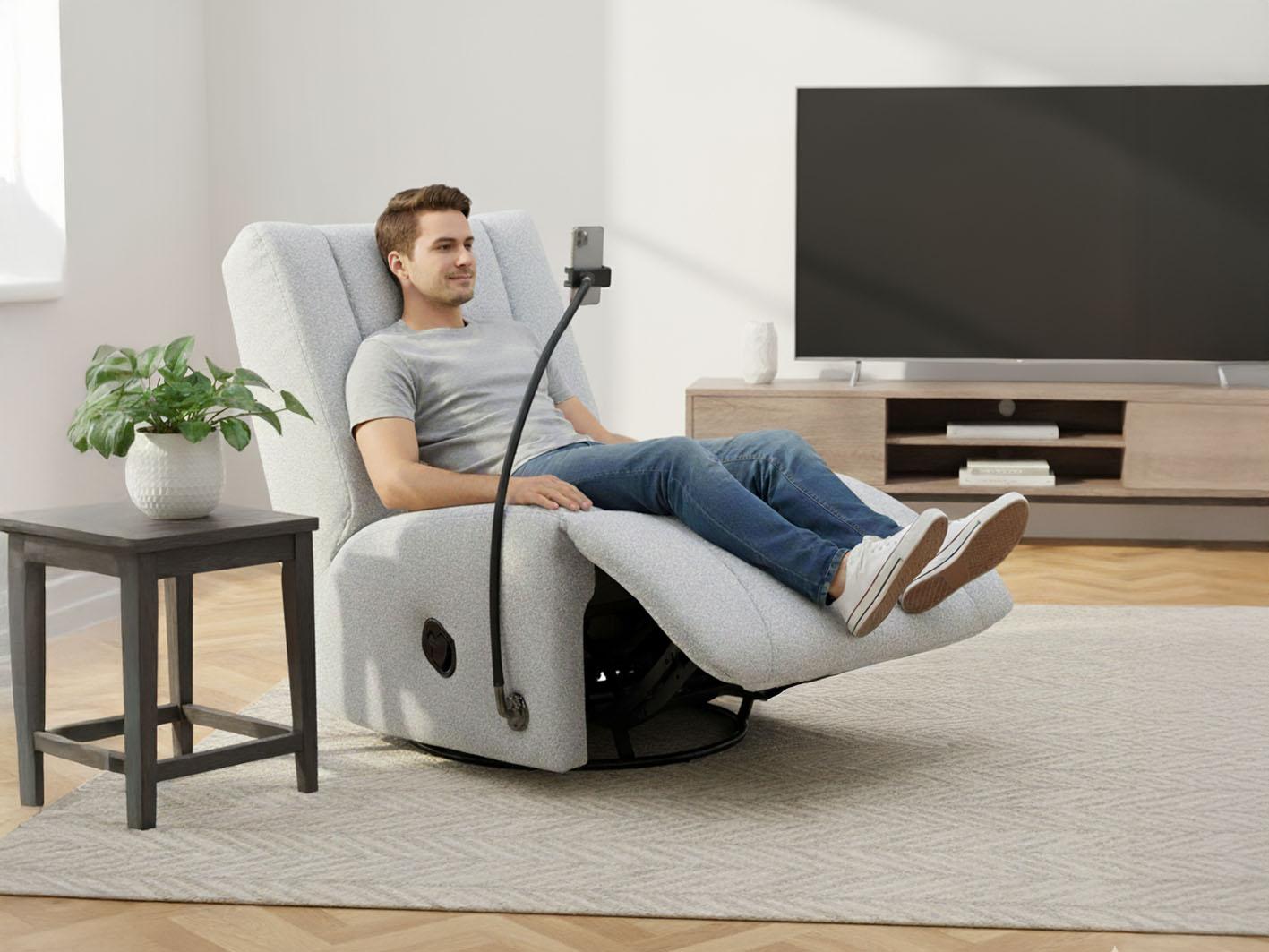 الأمر لا يقتصر على الراحة فحسب، بل يمتد ليشمل التقنية الحديثة. يأتي الكرسي مزودًا بقاعدة تثبيت للجوال مرنة وقابلة للتعديل لتتيح لك مشاهدة الأفلام أو عقد الاجتماعات الافتراضية بسهولة تامة، بالإضافة إلى خاصية الشحن المدمجة التي تبقي هاتفك مشحونًا طوال الوقت.مع إمكانية تعديل السعة لتناسب مختلف أحجام الهواتف، مما يضمن لك تجربة استرخاء عملية تجمع بين الراحة والتقنية الحديثة.