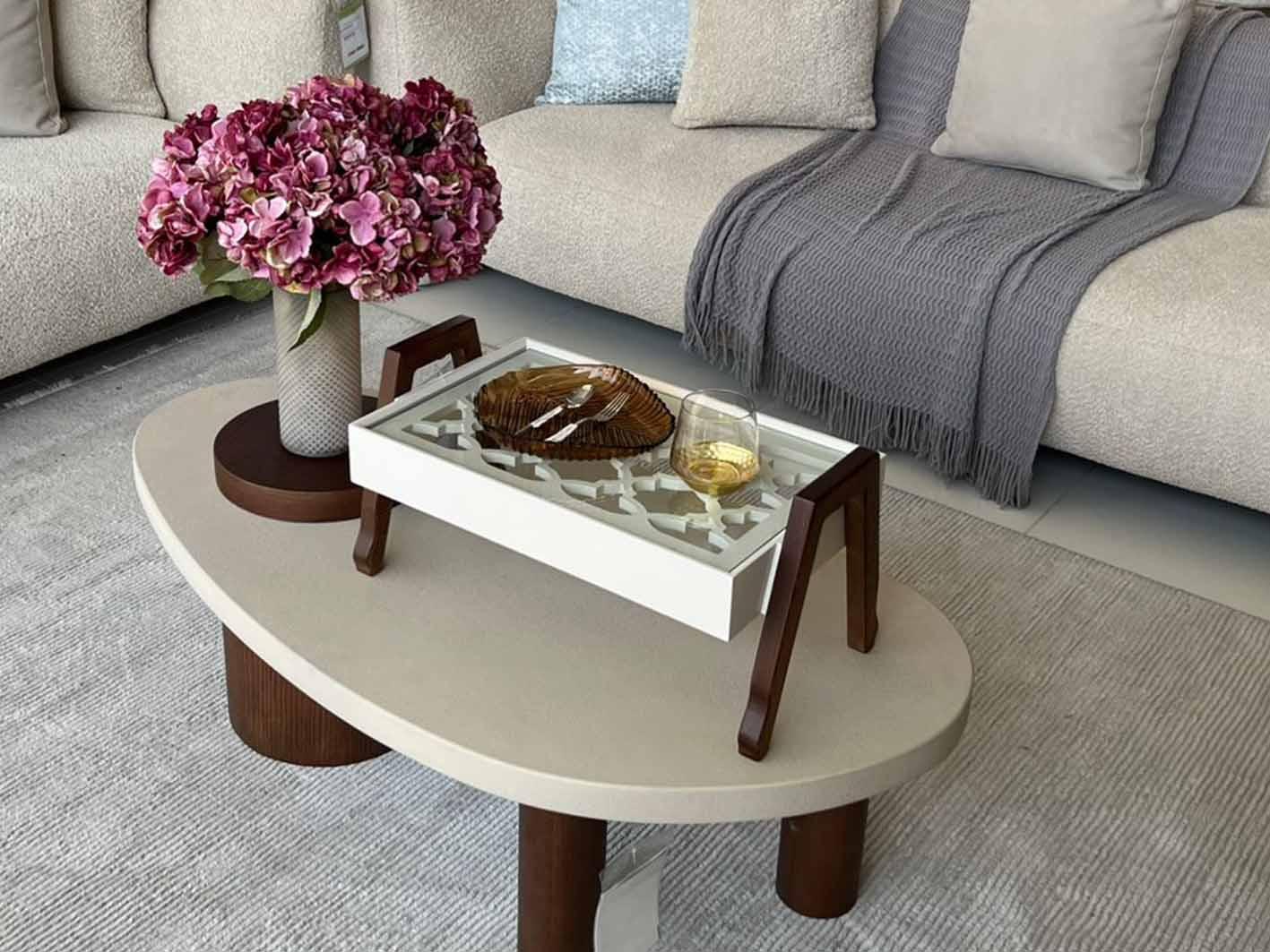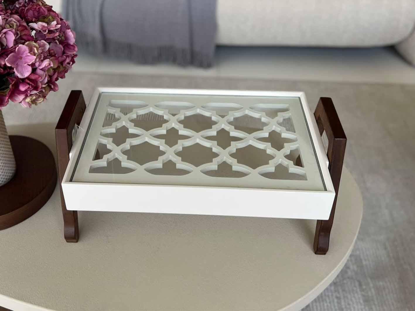 تم تصميم هذه الطاولة بعناية لتكون عنصرًا مثاليًا في غرفة المعيشة أو الجلوس، حيث يمكن استخدامها كطاولة تقديم أنيقة للقهوة أو الشاي عند استقبال الضيوف، أو كقطعة ديكور مركزية تزيّن طاولة القهوة بلمسة راقية. كما يمكن الاستفادة منها لتنسيق المزهريات، الشموع، أو الإكسسوارات المنزلية بطريقة مرتبة ومنسقة.