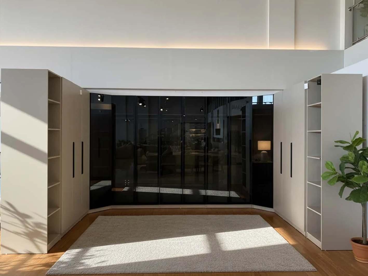 البابان الزجاجيان يضفيان لمسة عصرية على الغرفة. كما تسمح الرؤية الجزئية للمحتويات بالعثور على الملابس بسرعة وسهولة.