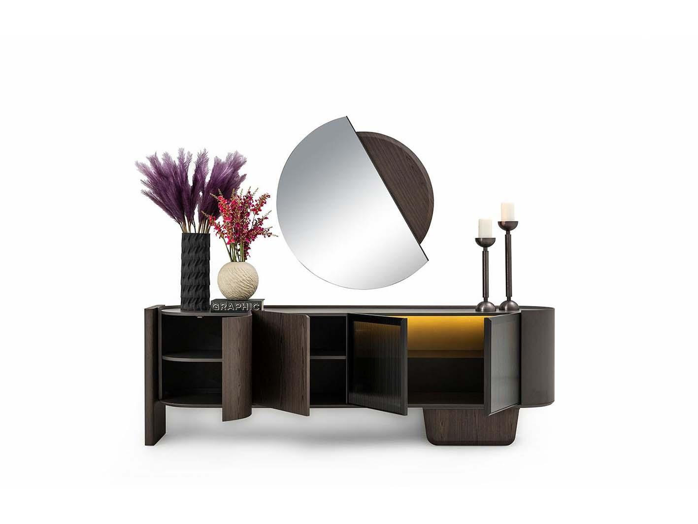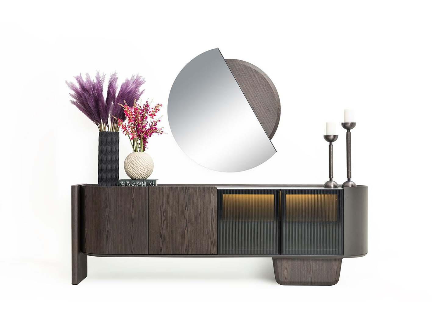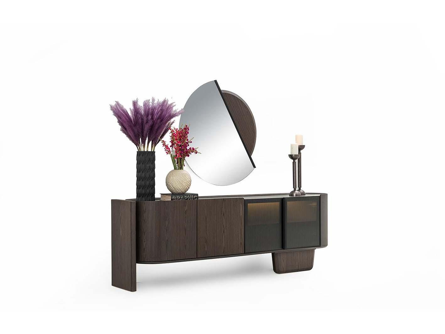 تأتي المرآة المصممة بشكل فاخر لتكمل مظهر الكونسول، مما يعزز من الإحساس بالمساحة ويضفي عمقًا بصريًا على الغرفة.
