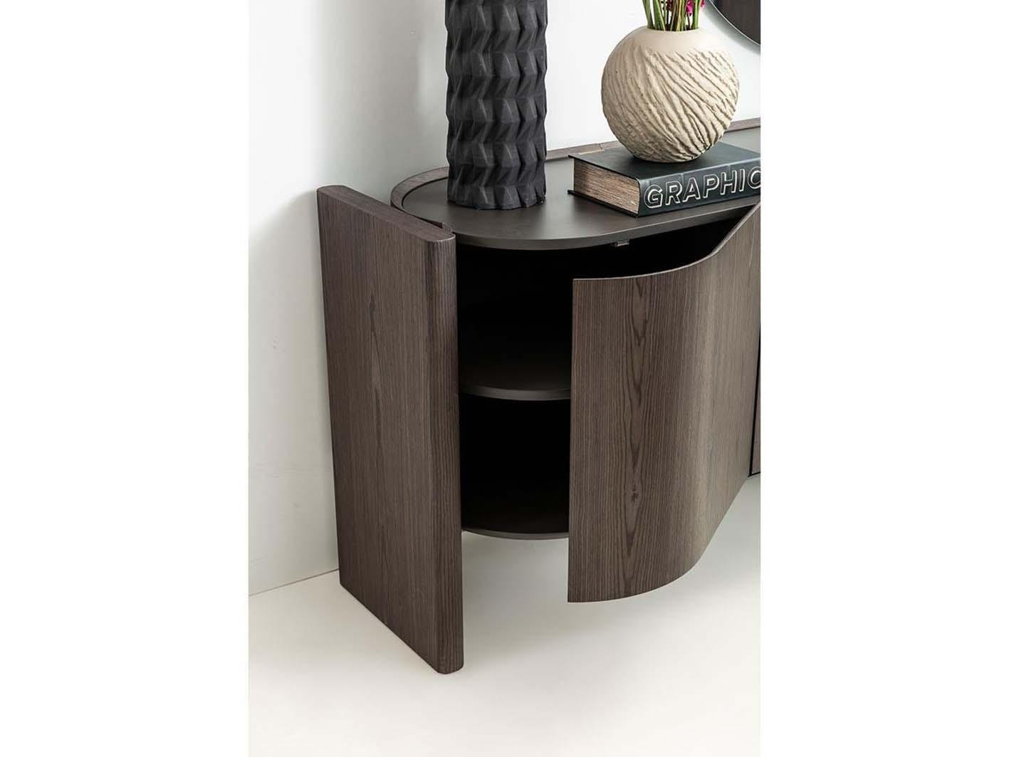 يتميز الكونسول بلمسة سطحية أنيقة من قشور الجوز التي تمنحه مظهرًا غنيًا ومتينًا يتحدى الزمن ويضفي عمقًا بصريًا للديكور.