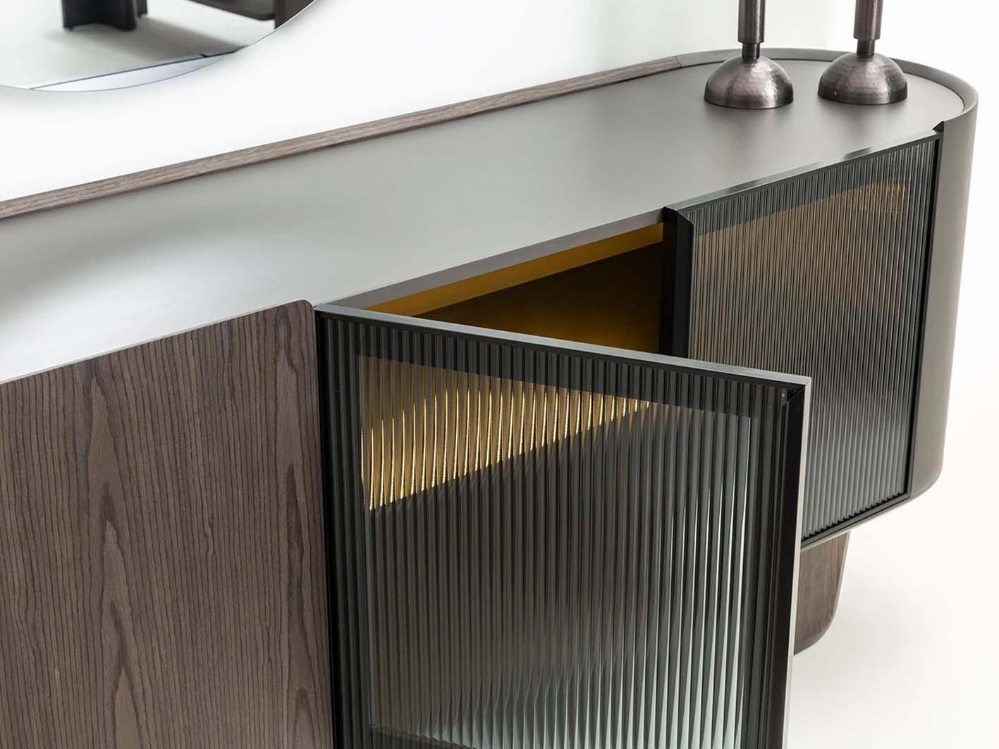 تضيف الأبواب المزينة بالزجاج المضلّع لمسة من الحداثة والأناقة، مع توفير إخفاء أنيق للمحتويات الداخلية بشكل يحافظ على جمال المظهر الخارجي.