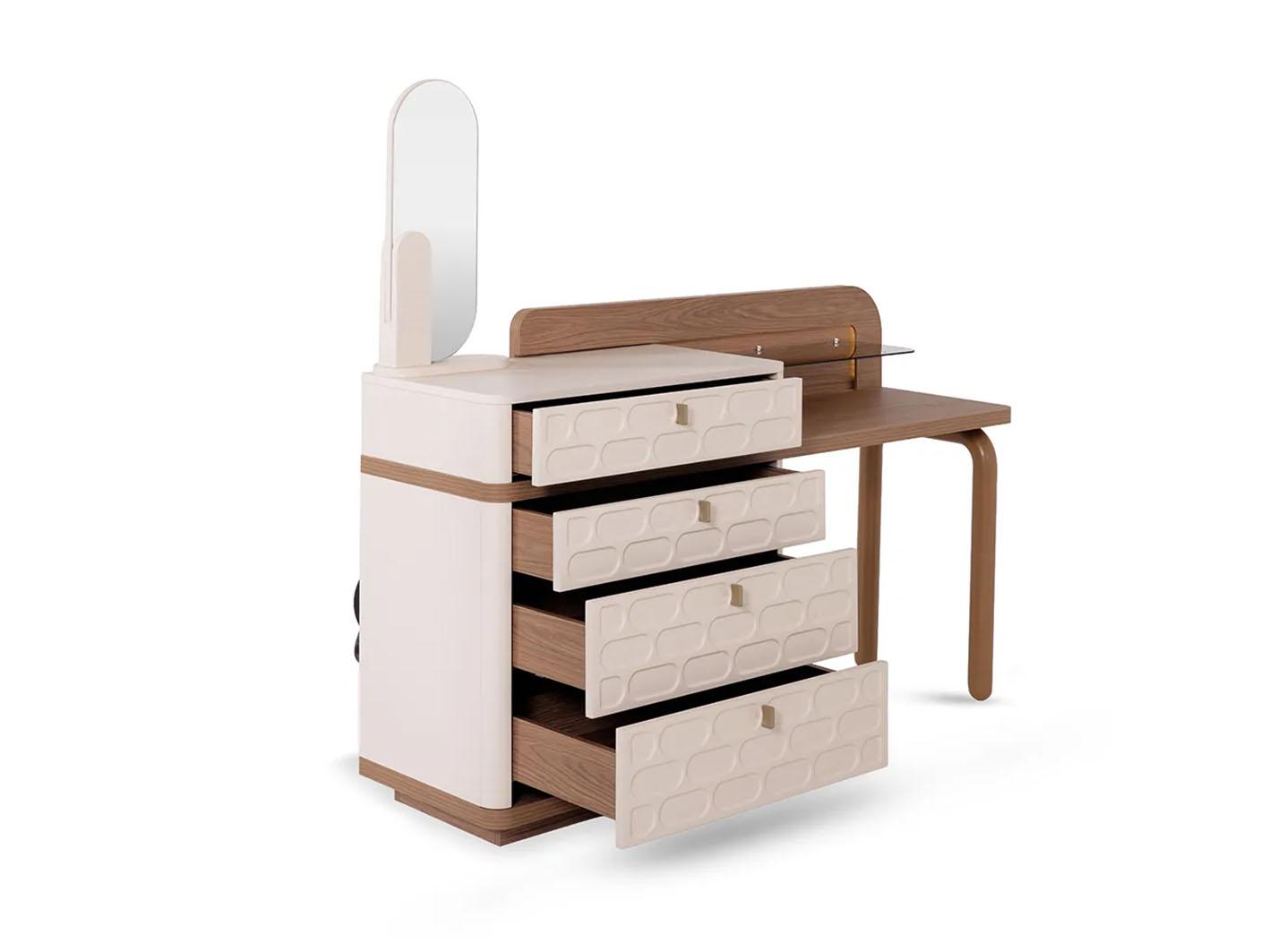 توفر السريحة والطاولتان الجانبيتان وحة الأدراج مساحات تخزين واسعة. بالإضافة إلى ذلك، تساعدك في الحفاظ على ترتيب الغرفة دون فقدان لمسة الأناقة.