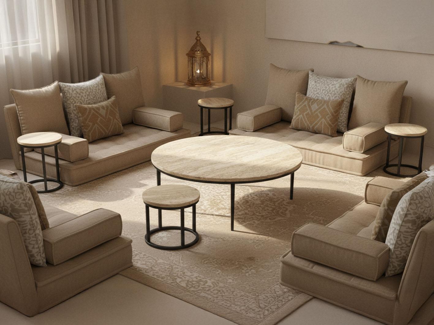 يمكن وضع الطاولات بسهولة أمام الوسائد الأرضية أو الأرائك. هذا التصميم يتيح مساحة مريحة للجلسات العائلية والتجمعات الصغيرة.