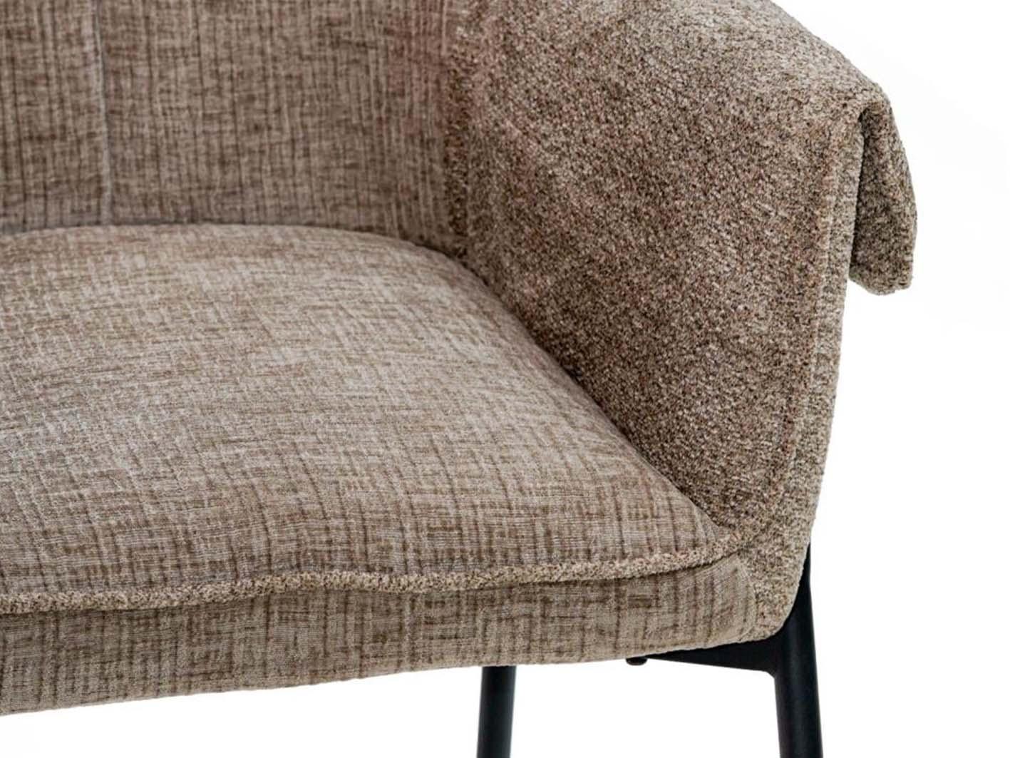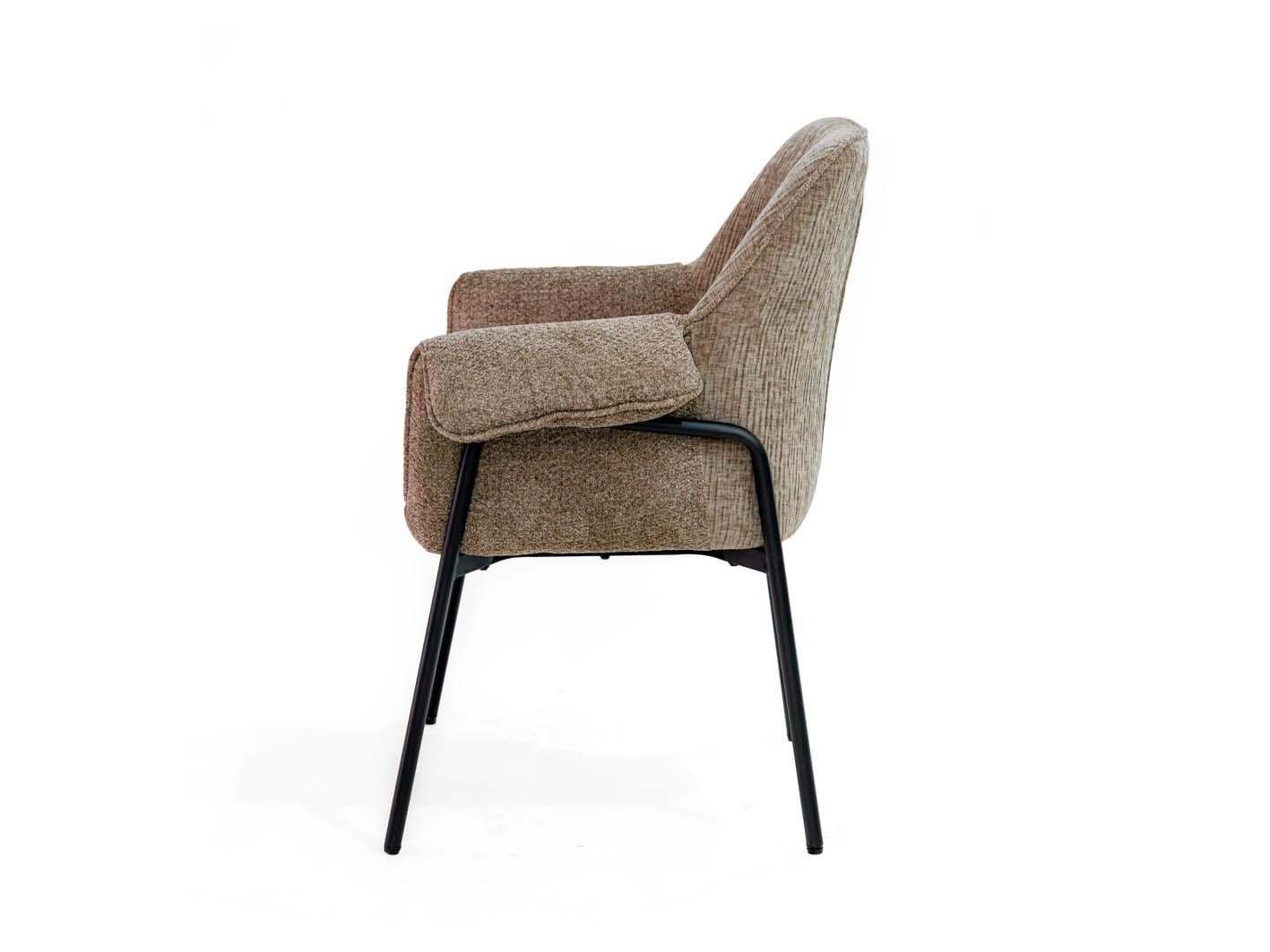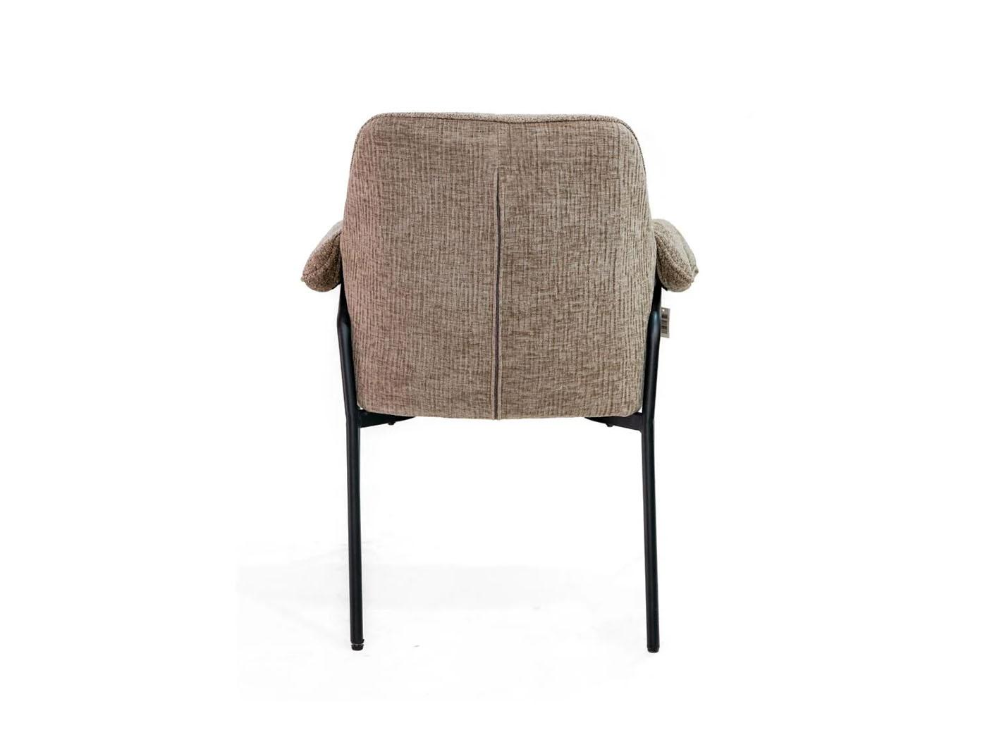 تعتمد قاعدة الكرسي على أرجل معدنية قوية بلون أسود غير لامع، تمنح الكرسي ثباتًا وأناقة صناعية متقنة، وتضيف لمسة تباين جذابة مع لون القماش البني.