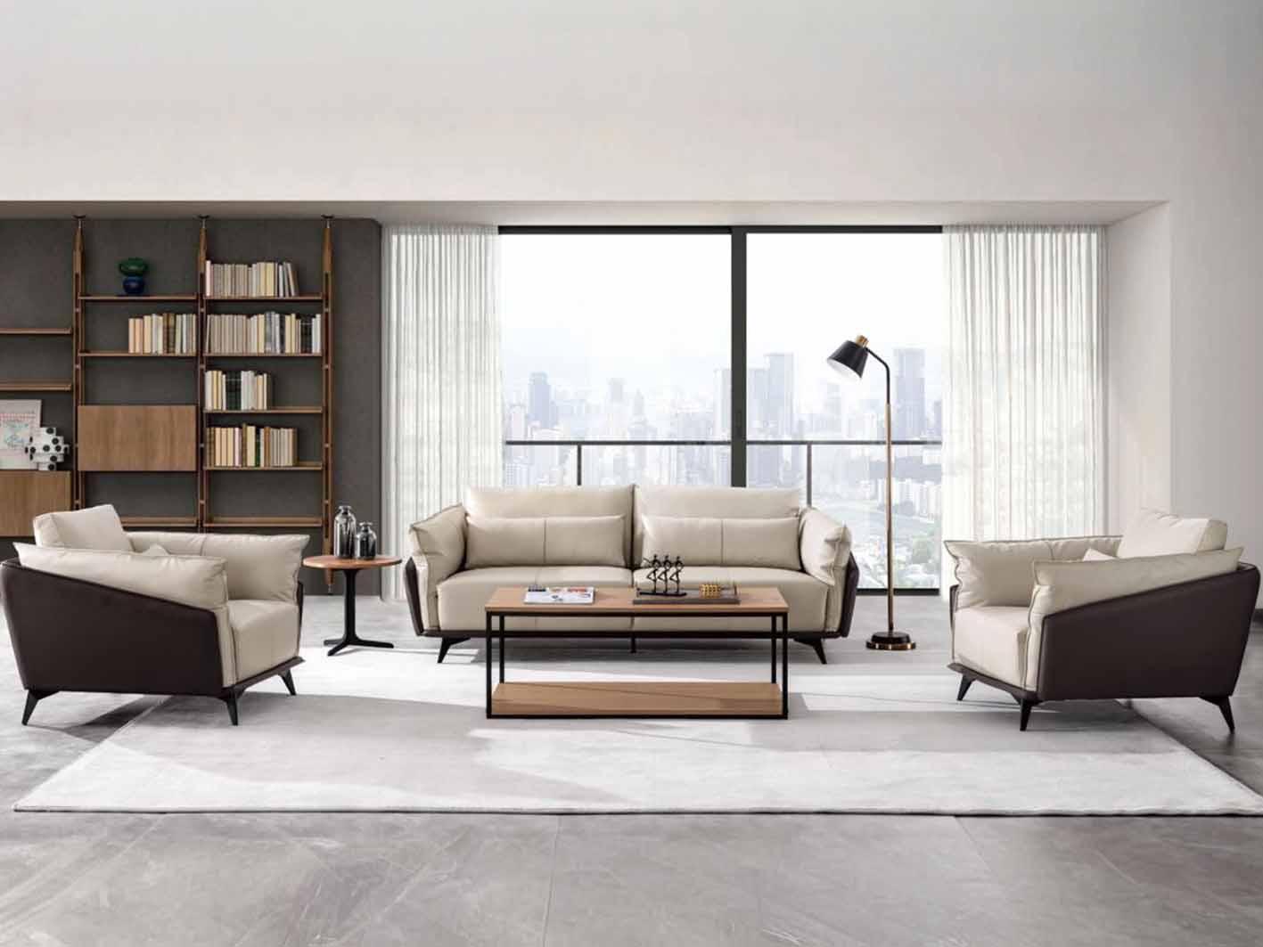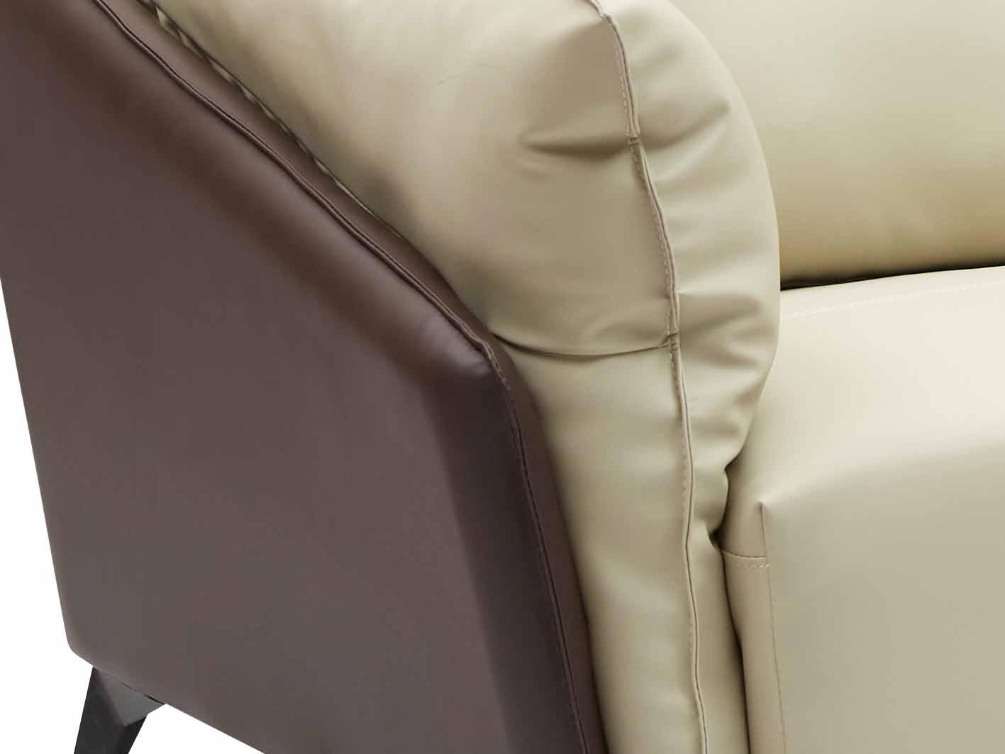 الجمع بين لون الأذرع والظهر البني H20 والمقعد والوسائد البيج 1102-5 يمنح الكنب حضورًا راقيًا ومتوازنًا بصريًا.
