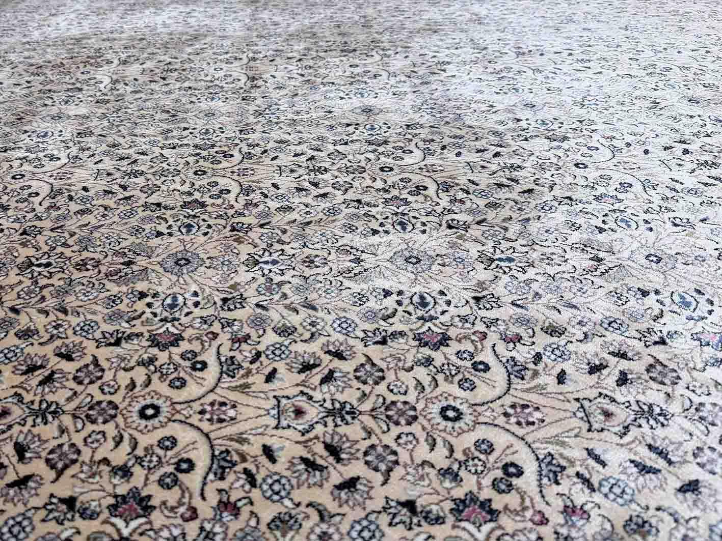 ويتميز تصميم السجادة بنمط شرقي دقيقة تمنحها طابعًا غنيًا بالتفاصيل، بدءًا من الإطار الخارجي متعدد الطبقات وحتى النقوش المتناسقة في الوسط. لذلك، تظهر السجادة كقطعة فنية تضيف عمقًا وأناقة لأي غرفة، سواء كانت غرفة معيشة، مجلسًا عصريًا، أو غرفة نوم تحتاج إلى لمسة من الدفء والرقي. كما يسهم توازن النقوش في إبراز مساحات الغرفة بشكل أكثر جمالًا دون ازدحام بصري.