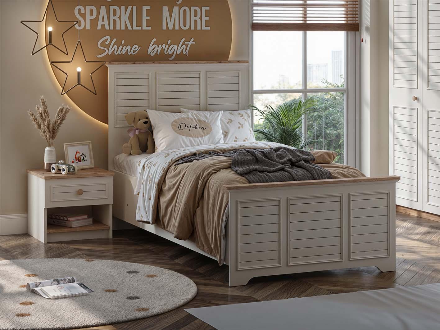 يتميز كمدينو بولو بلونه الأبيض النقي الذي يضفي على الغرفة إحساسًا بالنظافة والاتساع، بينما يضيف سطحه الخشبي الفاتح لمسة طبيعية دافئة تكمّل جمالية التصميم وتمنحه حضورًا هادئًا ومريحًا. هذا التباين بين الأبيض والخشب يجعل القطعة مناسبة لمختلف أنماط الديكور سواء كان مودرن، بسيط، أو حتى اسكندنافي.