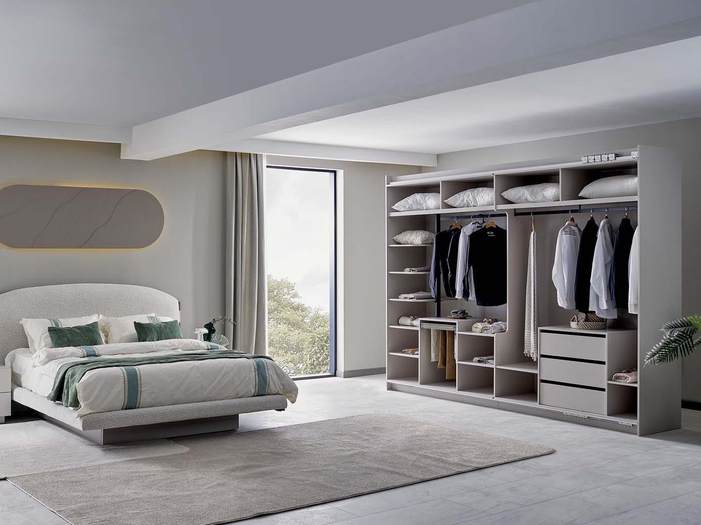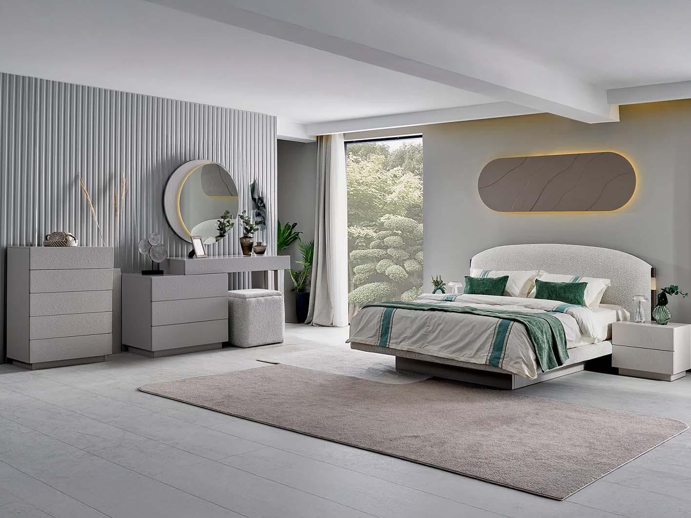 يعتمد التصميم على تدرجات اللون الكريمي الهادئة، مما يضفي شعورًا بالسكينة. كما أن خطوطه الانسيابية تمنح الغرفة مظهرًا عصريًا وفخمًا في الوقت نفسه.