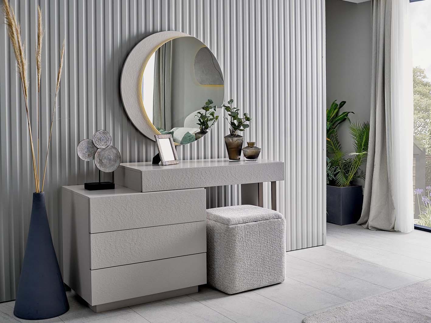 تأتي التسريحة مع مرآة مستديرة تضيف بعدًا جماليًا للمكان. كما أن تصميمها العملي يوفر لك مساحة مثالية للعناية اليومية.