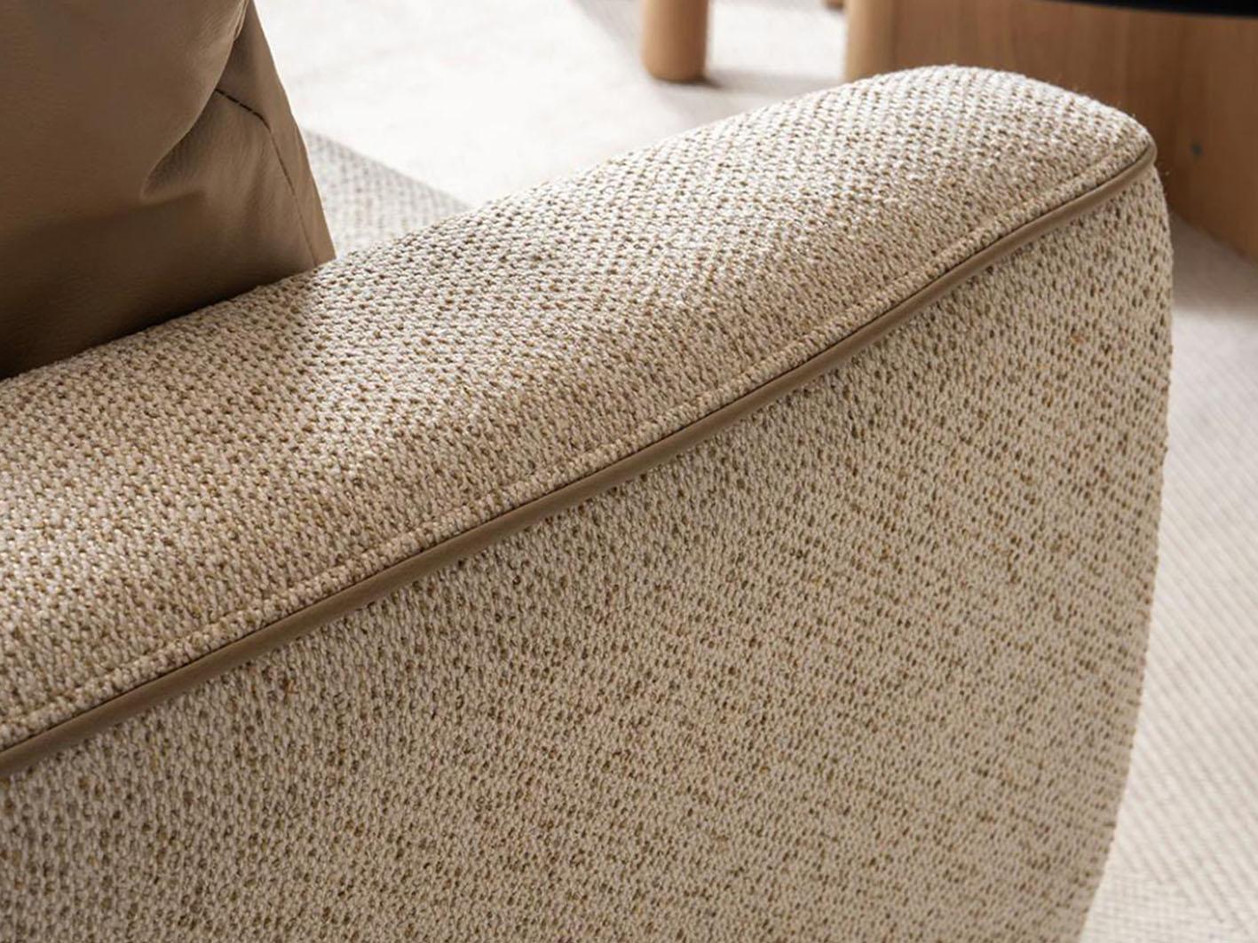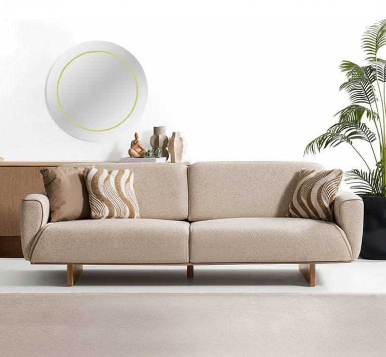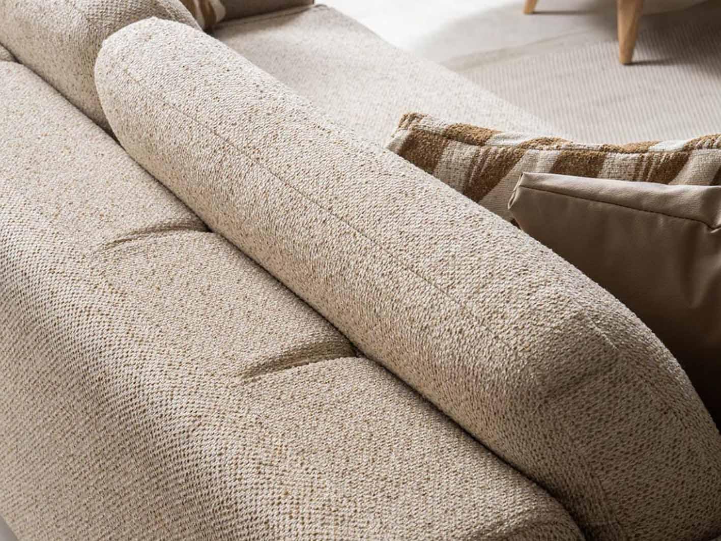 تم تصنيع القماش من مزيج فاخر بنسبة 80% بولي بروبلين، 10% قطن، و10% بوليستر. هذا المزيج يمنح ملمسًا ناعمًا مع مقاومة عالية للتآكل، ليبقى الكنب أنيقًا لفترة أطول.
