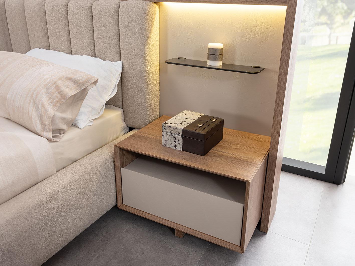 أرفف عرض التحف والديكور: واحدة من أبرز مميزات غرفة نوم لوجانو هي الأرفف المدمجة في اللوح الخلفي للسرير، والتي توفر مساحة مثالية لعرض تحفك الفنية المفضلة أو الكتب والإكسسوارات، مما يمنح الغرفة لمسة شخصية ومظهرًا أنيقًا ومرتبًا.