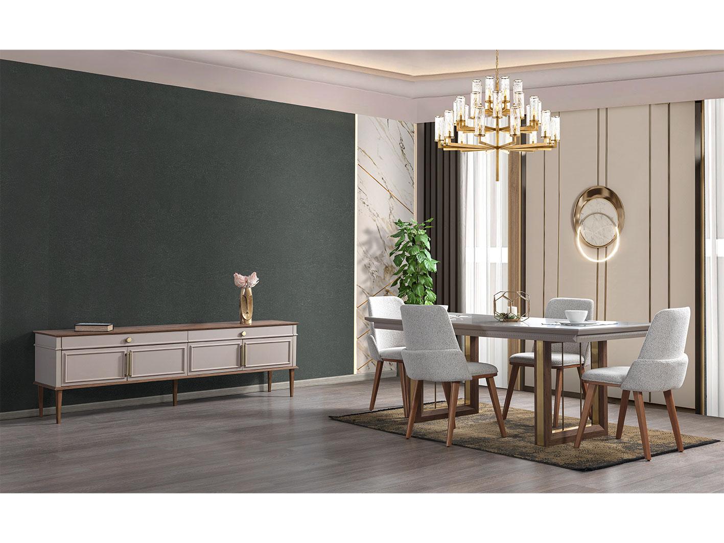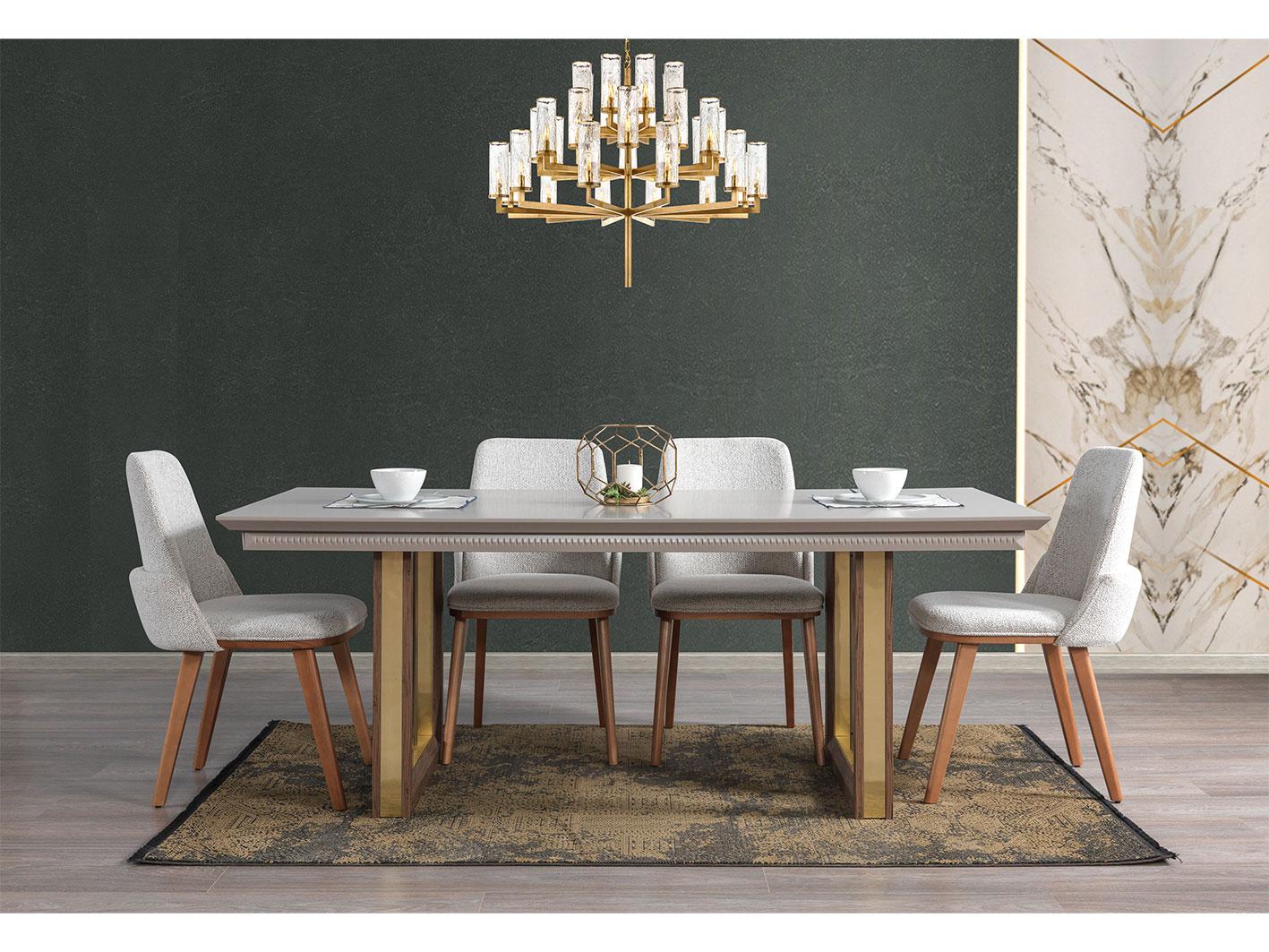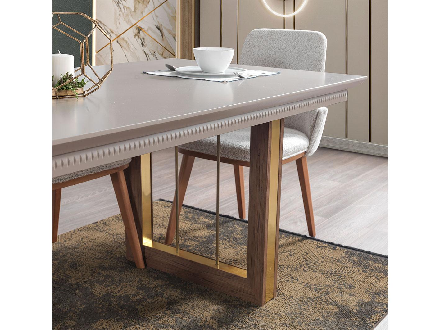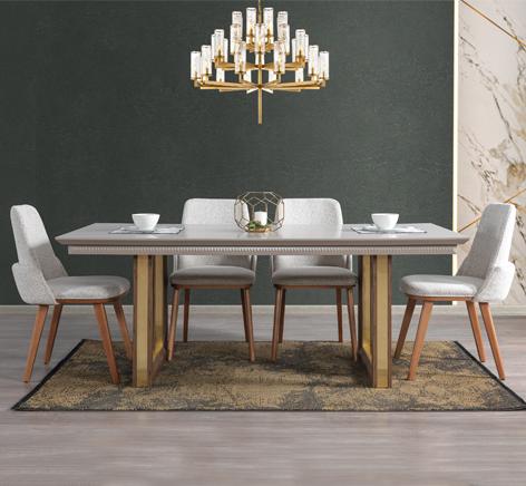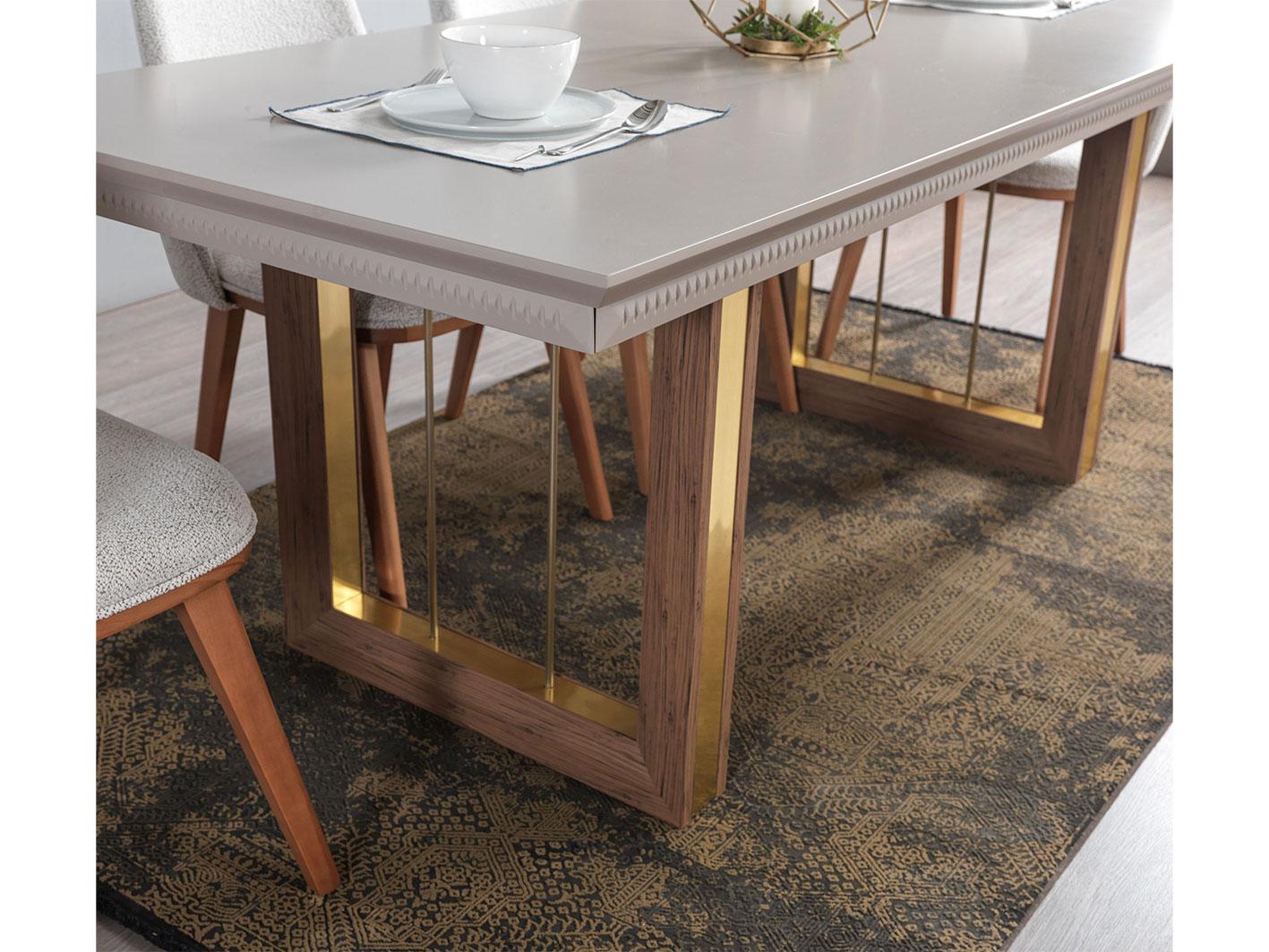 تأتي الطاولة بأرجل خشبية صلبة تعزز الاستقرار وتضيف لمسة أنيقة لا مثيل لها. تم صقل الأرجل بتشطيب ذهبي فاخر، ما يمنحها طابعًا راقيًا يعكس الذوق الرفيع. يجمع هذا التصميم بين القوة والجاذبية البصرية، مما يجعل الطاولة قطعة ديكور بارزة في أي مساحة طعام.