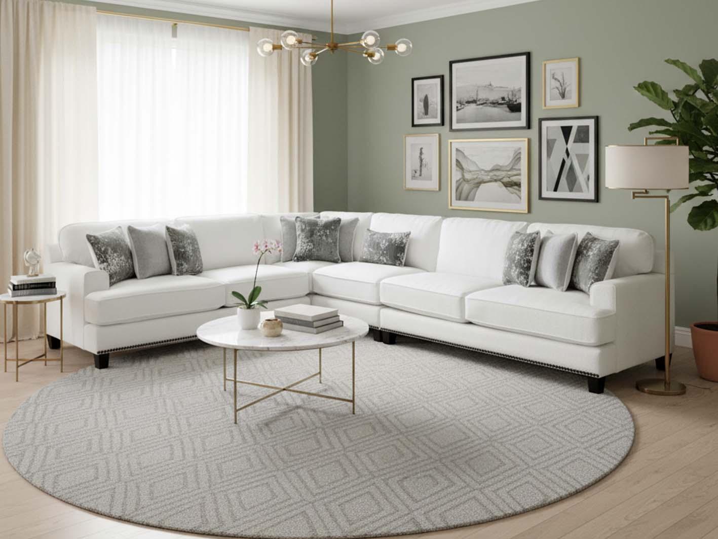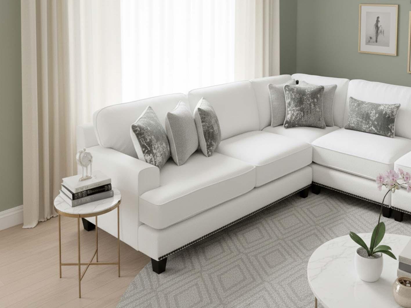 يُضفي اللون الأبيض النقي لمسة من الصفاء والبساطة الراقية، كما يعزز الإحساس بالاتساع والإشراق داخل الغرفة. وقد تم اختيار القماش بعناية ليجمع بين الملمس الناعم والمتانة العالية، مما يحافظ على مظهر الكنب الأنيق مع مرور الوقت ويجعله مناسباً للاستخدام اليومي دون أن يفقد فخامته.
