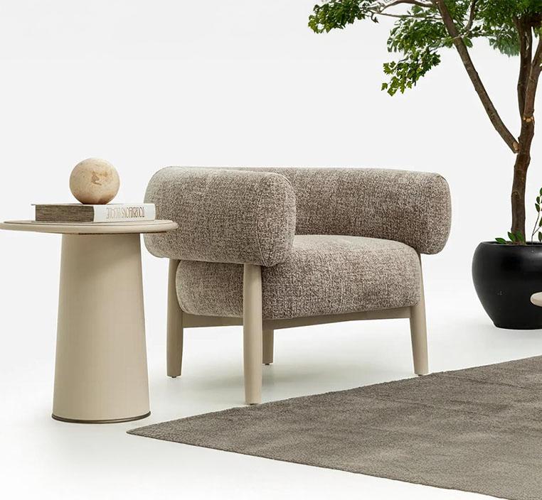 تم تنجيد الكنب بخامة البوكليه العصرية، وهي خامة ناعمة الملمس تمنح شعوراً مريحاً وتتميز بقدرتها على تحمل الاستخدام اليومي. هذا القماش من أحدث صيحات الديكور العالمي ويضفي لمسة عصرية دافئة على أجواء المنزل.