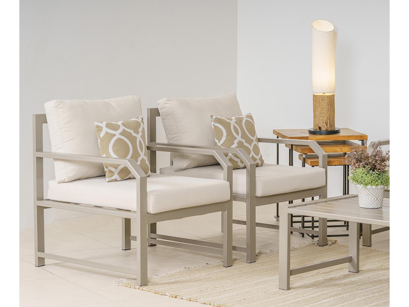 يمتاز تصميمها الثنائي بالحجم المثالي الذي يجمع بين الراحة والعملية دون أن يشغل مساحة كبيرة، مما يجعلها مناسبة للشرفات الضيقة والمساحات المفتوحة على حد سواء. أما اللون البيج، فيمنح مرونة عالية في التنسيق مع بقية الأثاث الخارجي مثل الطاولات الجانبية، المظلات، أو النباتات الطبيعية، ليخلق بيئة متوازنة وأنيقة.