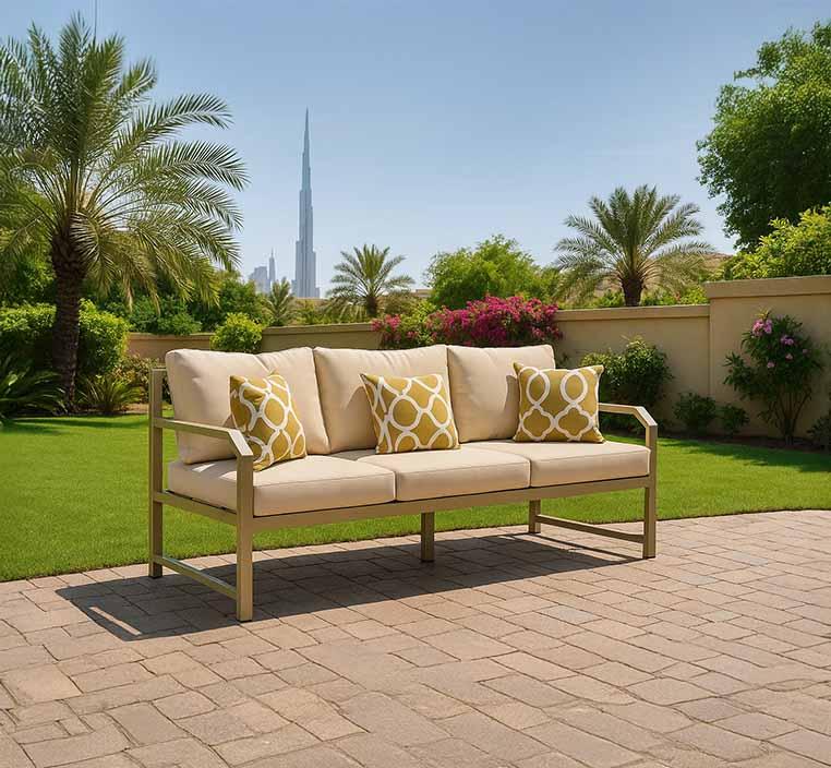 يمتاز تصميمها الثنائي بالحجم المثالي الذي يجمع بين الراحة والعملية دون أن يشغل مساحة كبيرة، مما يجعلها مناسبة للشرفات الضيقة والمساحات المفتوحة على حد سواء. أما اللون البيج، فيمنح مرونة عالية في التنسيق مع بقية الأثاث الخارجي مثل الطاولات الجانبية، المظلات، أو النباتات الطبيعية، ليخلق بيئة متوازنة وأنيقة.