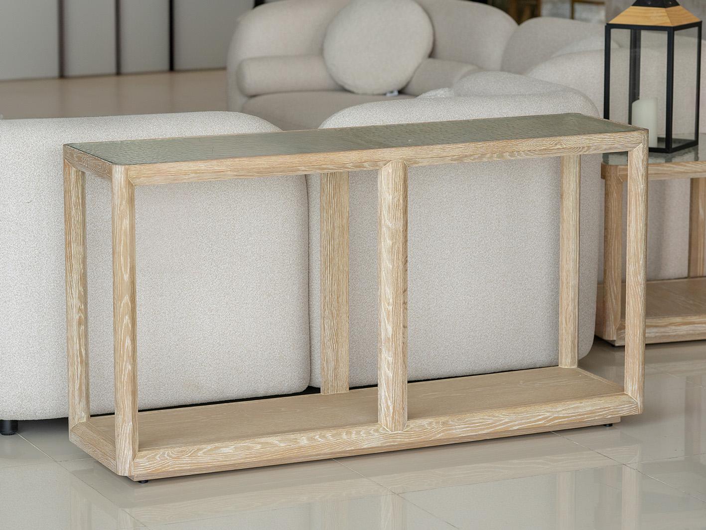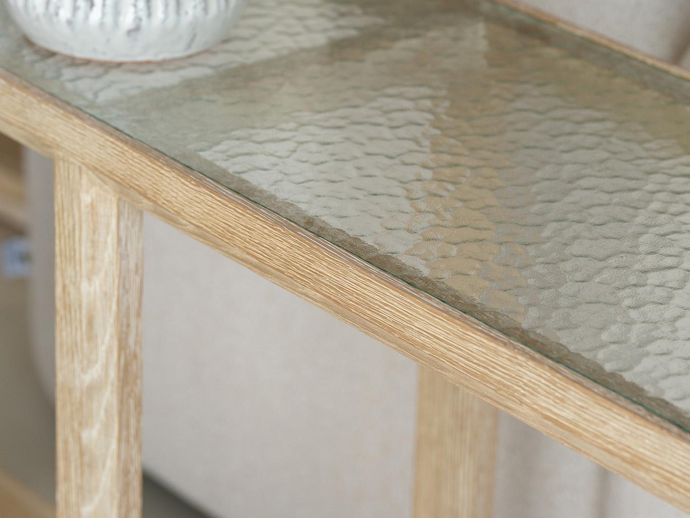 ما يميز هذا الكونسول عن غيره هو سطحه الزجاجي المموج، الذي يضيف لمسة من التميز والجمال إلى تصميمه. يعكس الزجاج المموج الضوء بشكل رائع ويعزز من إشراقة المكان، ليمنح طاولة مدخل مظهرًا فاخرًا وساحرًا. كما يتمتع السطح الزجاجي بمتانة عالية ويضفي لمسة عصرية على الأثاث التقليدي.