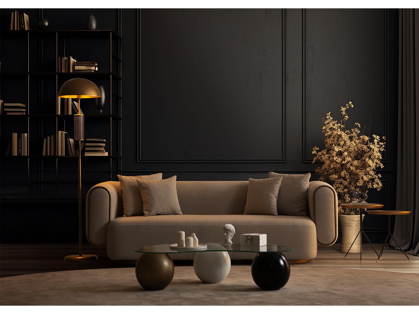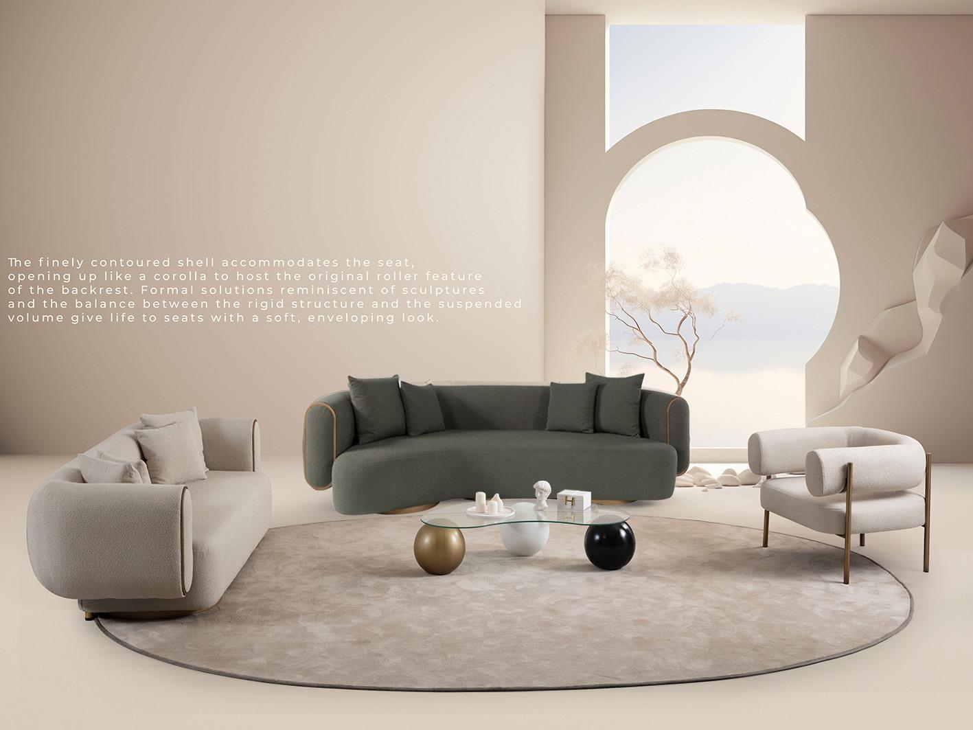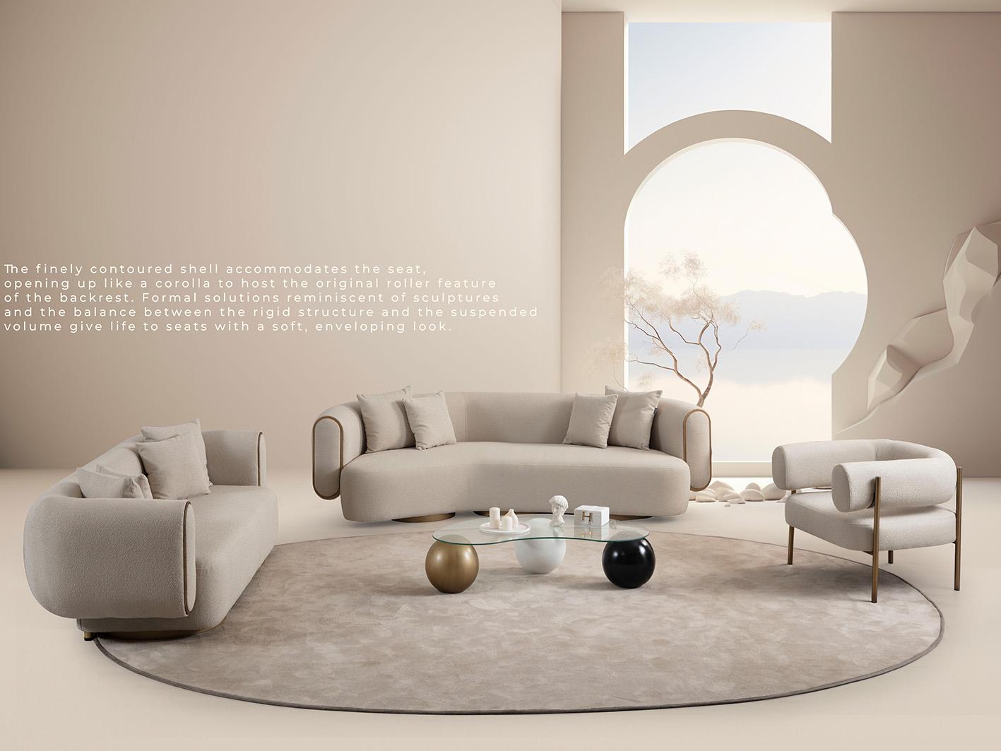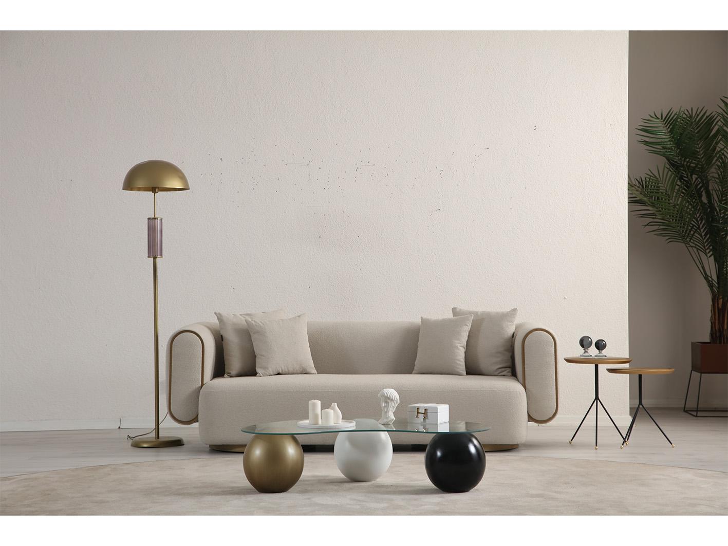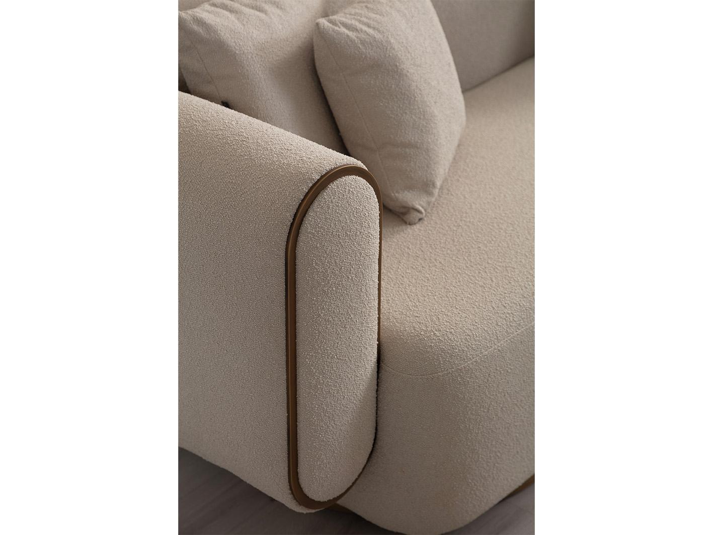 تم تصنيع كنبة سايستا باستخدام هيكل داخلي متين من خشب الـ plywood عالي الجودة، مما يمنحها ثباتًا قويًا ومتانة تدوم طويلاً. أما الأرجل فهي مصنوعة من الفولاذ المقاوم للصدأ بتشطيب أنيق بلون ذهبي غير لامع (brushed gold)، تضيف لمسة فاخرة للتصميم وتمنحها مظهرًا عصريًا.
