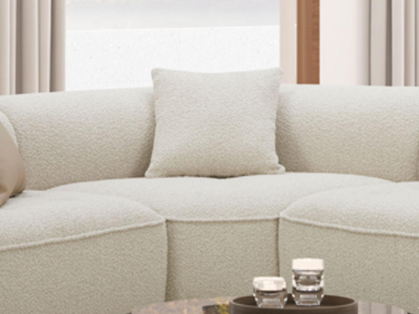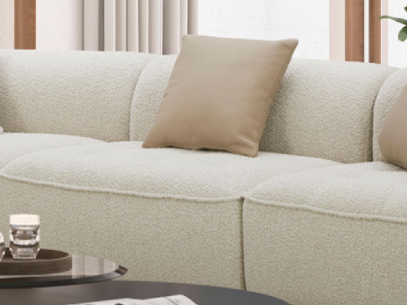 الكنب منجد بخامة البوكلية الفاخرة، ذات الملمس الناعم والمظهر العصري الذي يمنح المكان لمسة دافئة ومريحة. يتميز هذا القماش بمتانته العالية ومقاومته للاستخدام اليومي، مما يجعله مثالياً لمن يبحث عن الجودة والفخامة معاً.