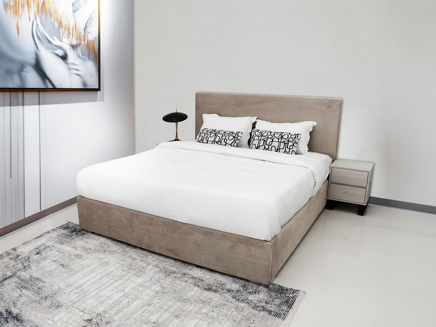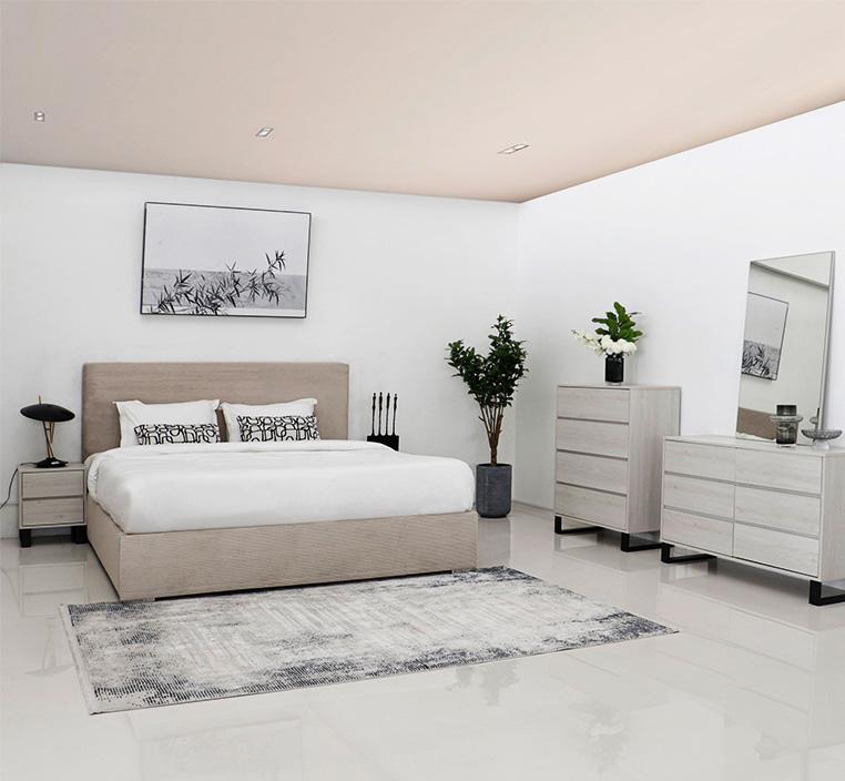 • يتميز طقم غرفة نوم عصري تورينو بتصميم عصري يجمع بين الخطوط النظيفة والتفاصيل الدقيقة. السرير منجد بالكامل بقماش مخملي ناعم باللون البيج، مما يضفي لمسة من الفخامة والدفء على الغرفة. كما أن النقوش العرضية على ظهر السرير تضيف لمسة من الجمال والأناقة.